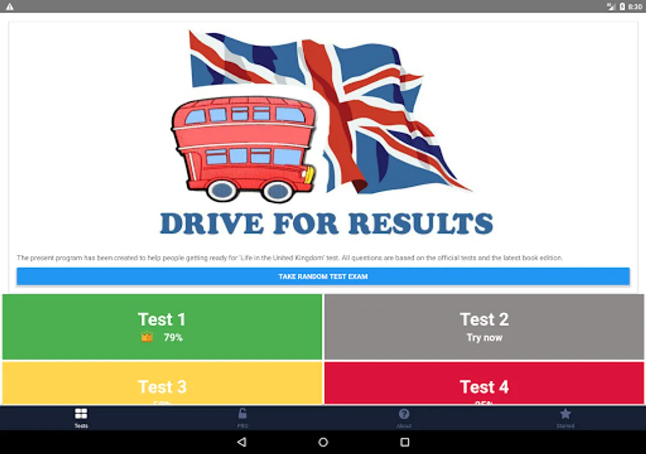 One of the options in the present app is “Random exam”. If you are not sure which test you want to do, use this option and we will choose a random test for you!