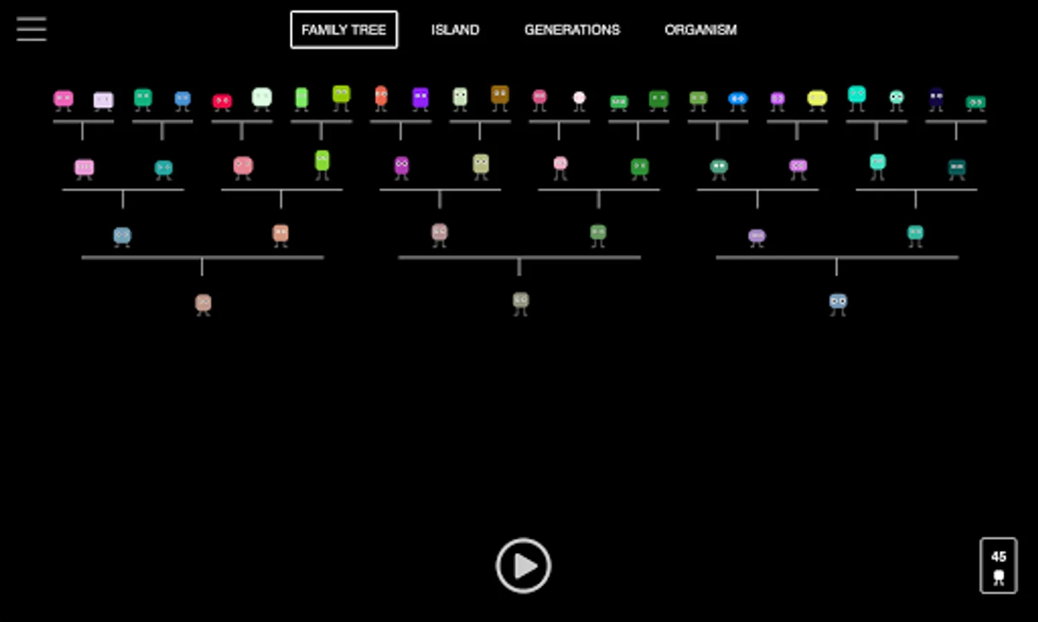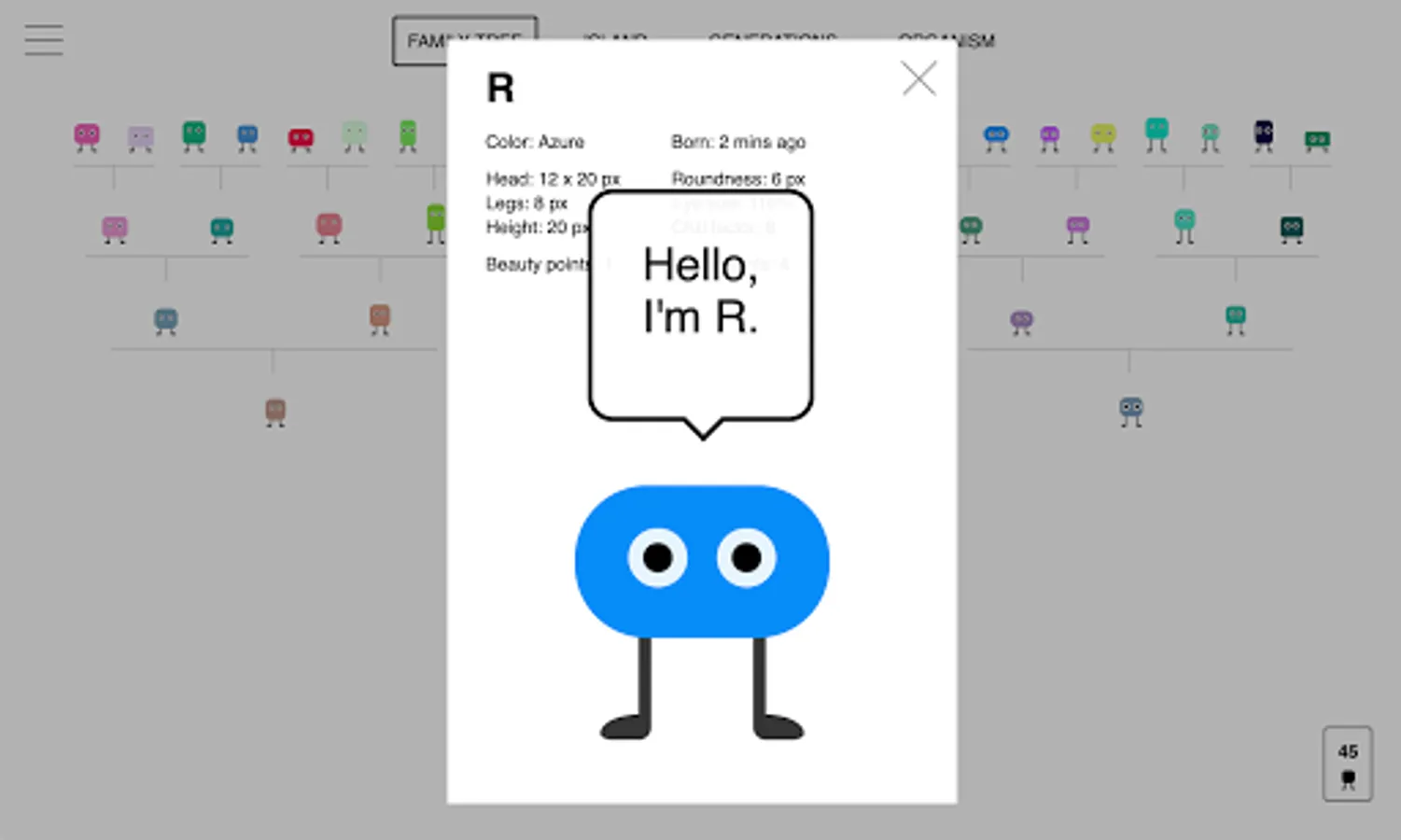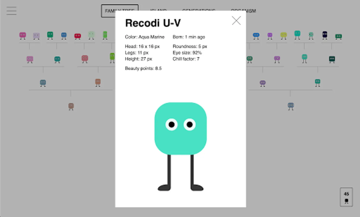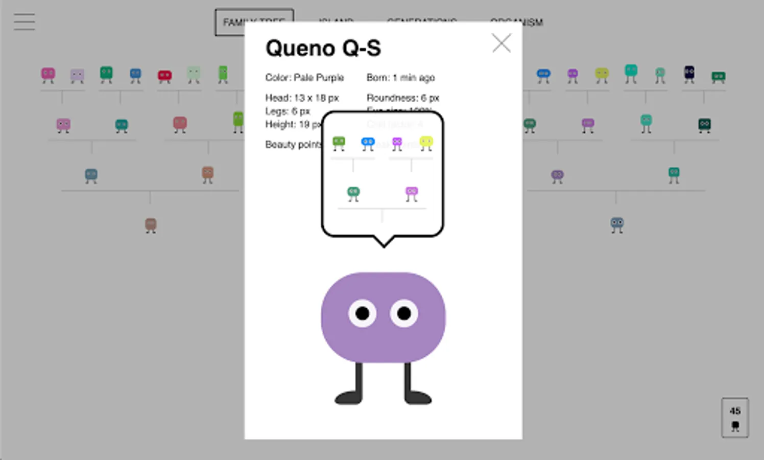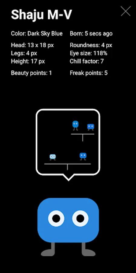 Life is a simulation that helps understanding evolution through playing. You can either let evolution run automatically or actively breed. When procreating, each life passes its parameters down to the next generation. There are mutations of all parameters that occasionally occur. When letting evolution run automatically, every once in a while you will face disasters that wipe out part of your population. Each life is given Beauty Points. The beauty scale reaches from one to ten points. If a life is especially unique, Freak Points are given to it. The Freak Point scale has no upper limit. Can you breed the most extraordinary life?