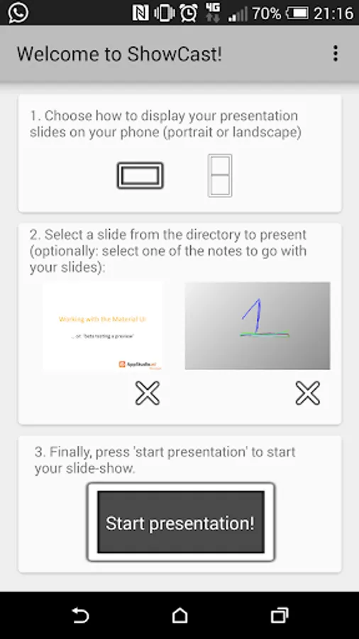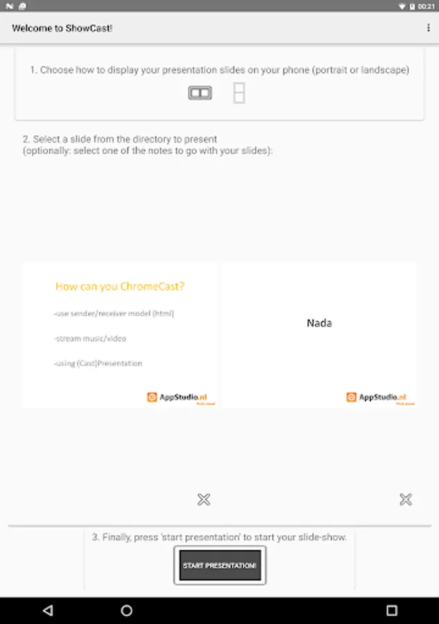You will start a slideshow of your presentation slides in your choice of orientation (landscape or portrait). Just flip through your slides like any other photo-app, and you can pinch-zoom to put extra focus on parts of your slide!