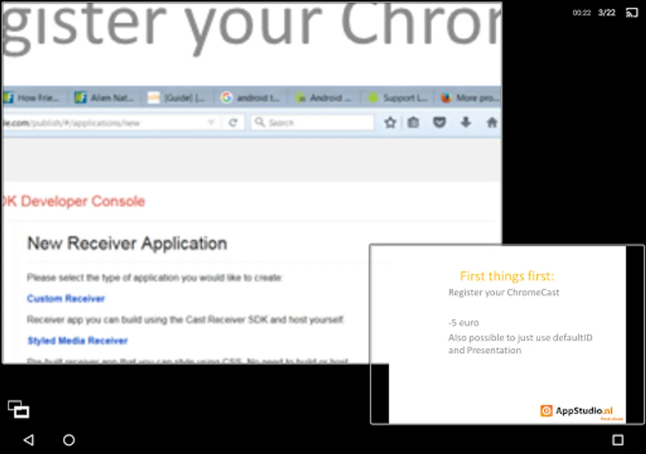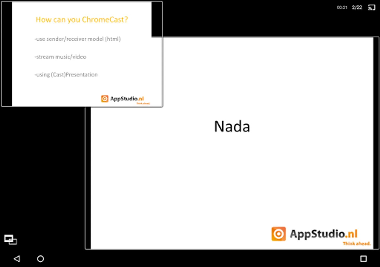 ADDED in v2.5: Full ChromeCast support. Thanks to the new API, you don't need the ChromeCast app to mirror your phone: just start your presentation and select your ChromeCast device using the usual ChromeCast button!