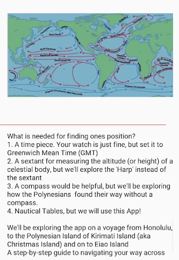 I decided to design the app to incorporate some of the methods the Polynesians used, and also to design some method to find land without the aid of a 'professional' sextant or GPS.