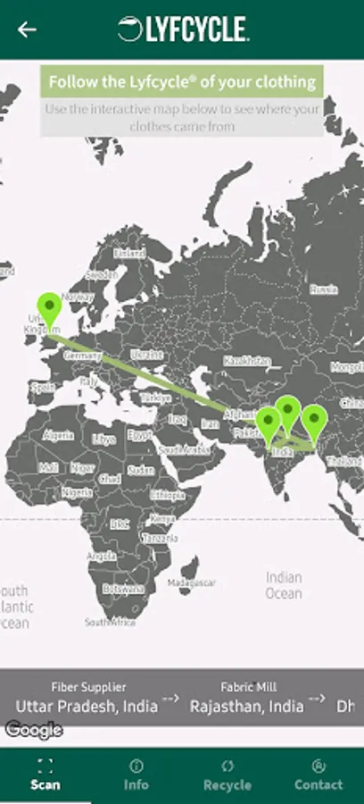 Lyfcycle® collaborates with high street and online fashion retailers to manufacture sustainable clothing. In line with our vision for sustainable fashion to be accessible and affordable to everyone, we have developed this app to encourage transparency in the clothing industry. If you've got your hands on one of our pieces of clothing, just scan the QR code on the label with this app to follow the Lyfcycle® yourself. You'll be able to see what makes up your clothes, what makes them sustainable and where they came from - from fibre to factory and ultimately, to the retailer you got them from.