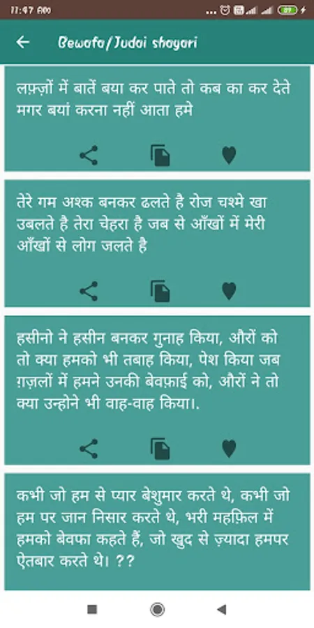 it's totally free offline shayari app. Use this amazing unlimited Hindi Shayari collection for read amazing new latest shayari and Easy share on social media & your family friends for status, message, birthday wishes, anniversary, all festival wishes message,Rakshabandhan(Rakhi) message,krishana shayari,Navaratri message, Love Shayari, sad Status, Bewafa shayari, Alone, Naseeb, Baby Shower, etc.