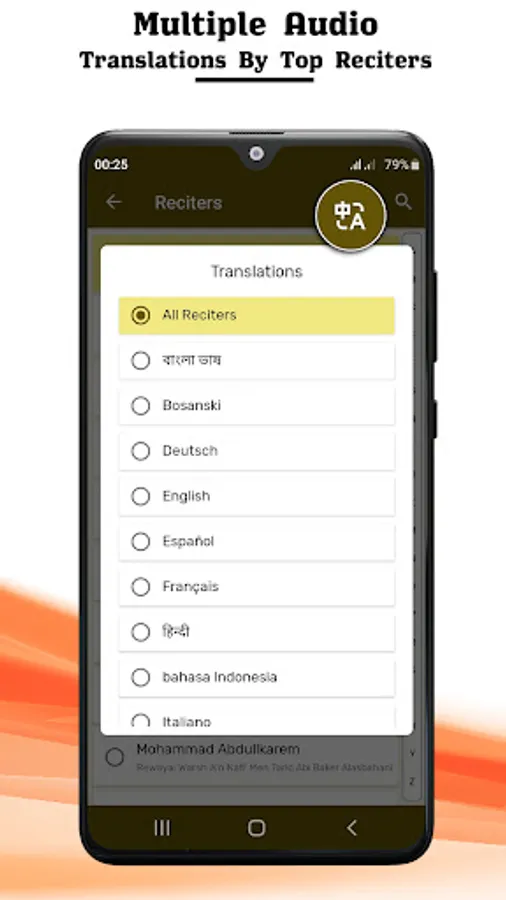 - Quran recitation by top famous reciters like Mishary Rashid Alafasy, Abdul Rahman Al-Sudais, Saad Al-Ghamdi, Ali Abdur-Rahman al-Huthaify, Qari Syed Sadaqat Ali, Ahmad Bin Ali Ajmi, Qari Waheed Zafar Qasmi, Abdullah Basfar