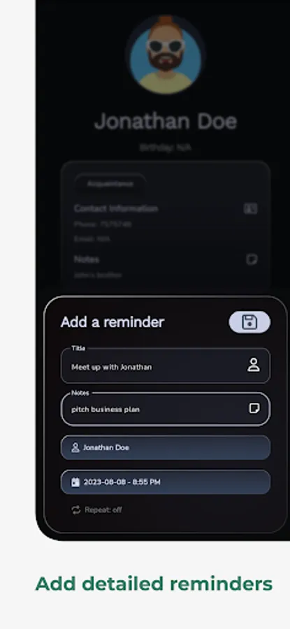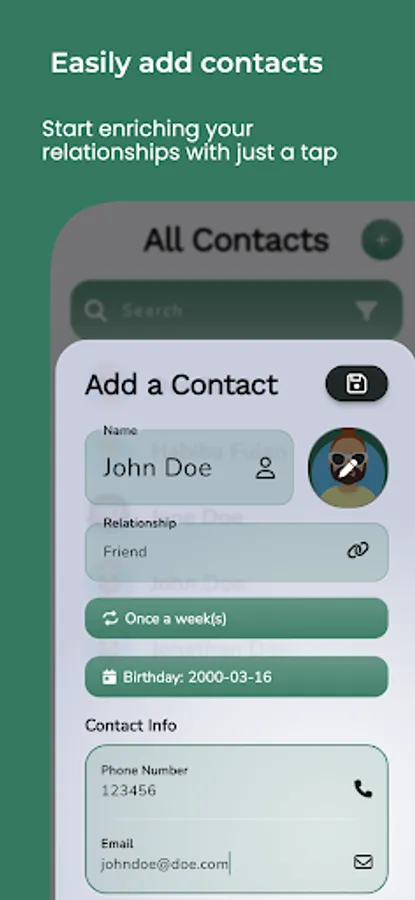 - Set individual reminders for each of your contacts. Whether you want to call your best friend every week or remind yourself to wish your mom on her birthday, our app ensures you'll never miss a beat.