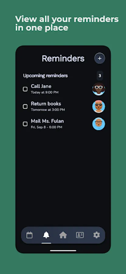 - With the calendar feature, you get a bird's-eye view of all your reminders. This makes it easy to plan ahead and ensure that you're dedicating time to all the people who are important to you.