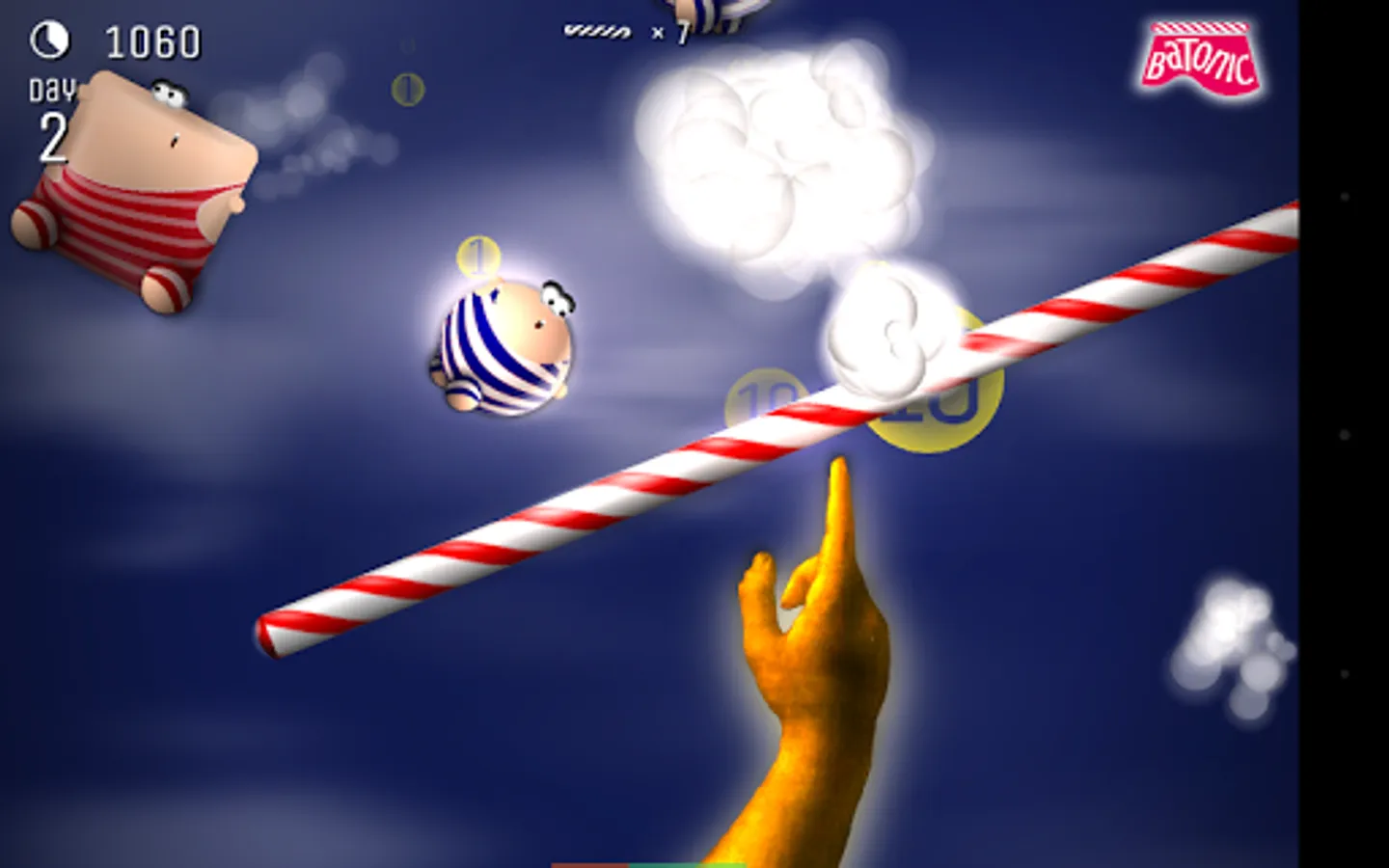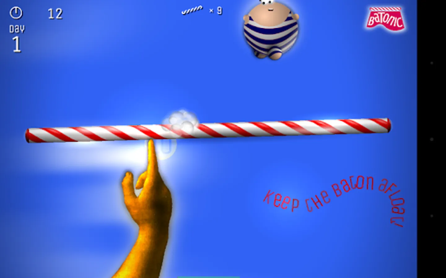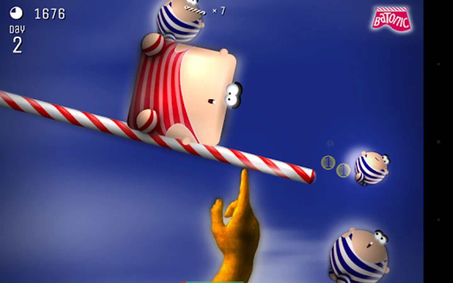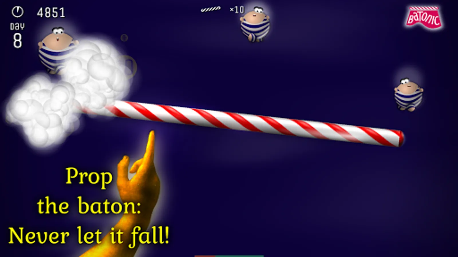 Batonic is a fast, frenzied, fun-filled 2D arcade game of skill and balance. Prop the baton on the tip of your finger — and deflect hordes of creatures that fall from the sky trying to strike you out of balance.