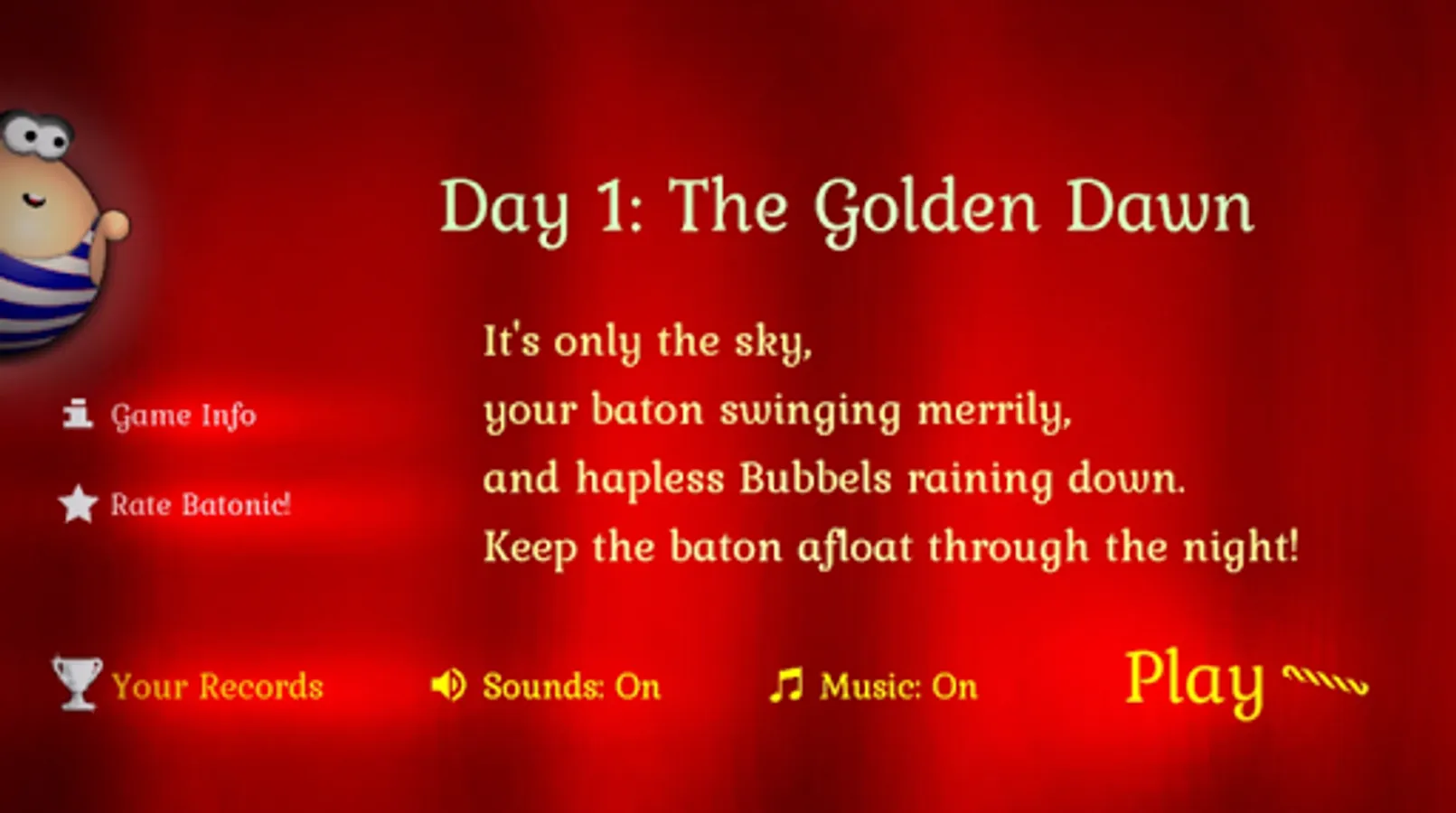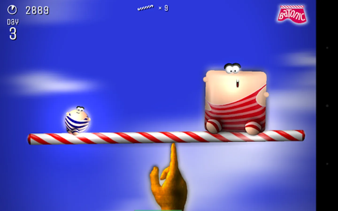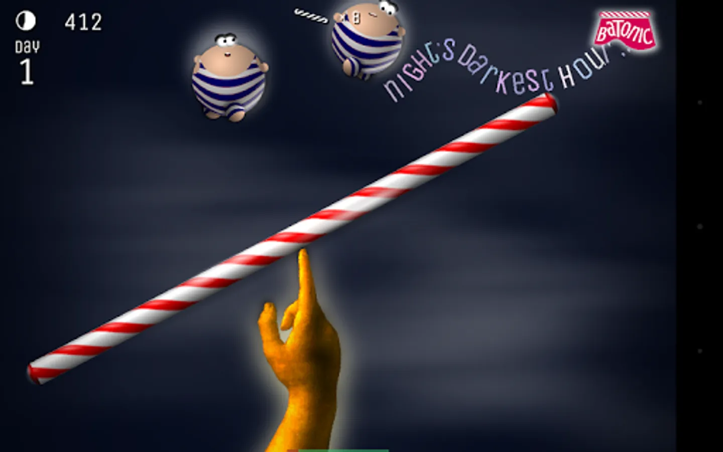 The game is divided into Days (levels) of increasing difficulty, each with a different set of conditions — winds, gravity, types and behaviors of the creatures. The first Days are easy enough for a preschooler, but surviving to the end of Day 10 (even though you have nine spare batons when you start) is no mean accomplishment for any adult.