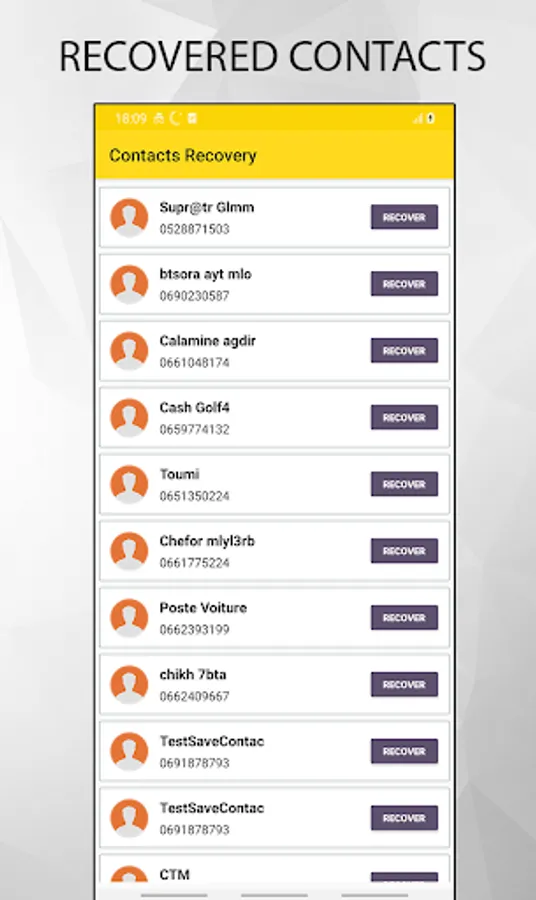 From the menu select “Recover Contacts” and accept the permission to access storage. Then a new page with all of your contacts will appear. Finally you can choose witches contacts to recover.