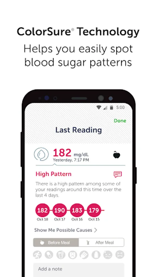 • Transforms data into colorful snapshots that connect your blood glucose with food, insulin and activity.
