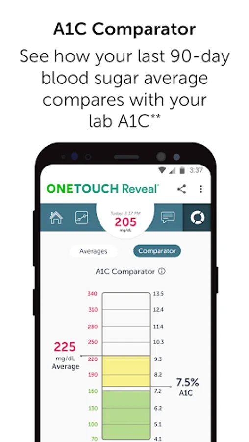 • The A1c comparator on the OneTouch Reveal® mobile app lets you compare your lab A1c to the average of your blood glucose readings from the last 90 days.