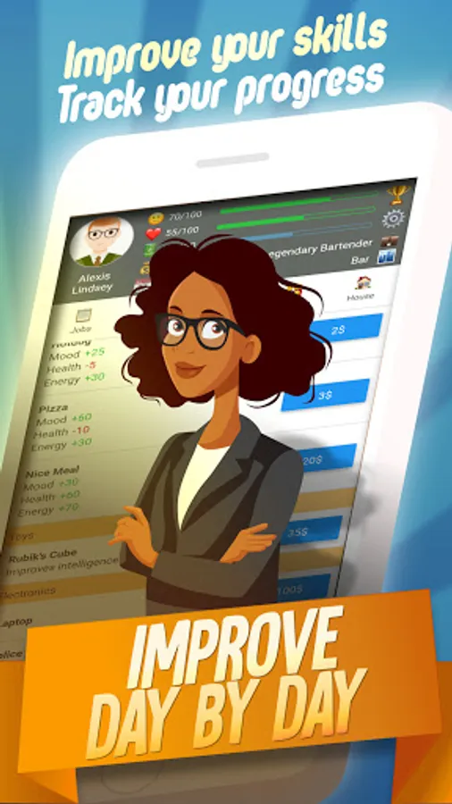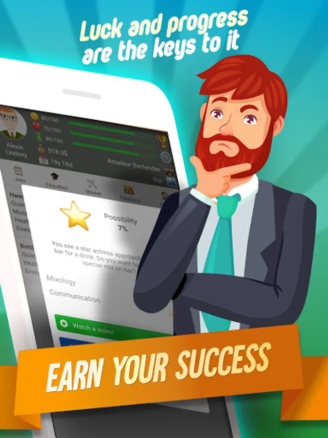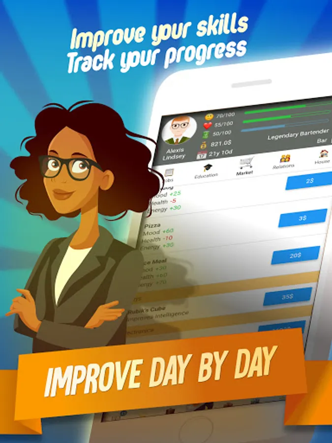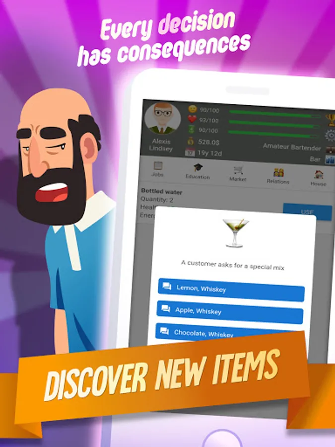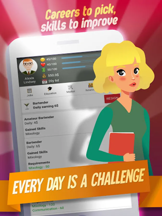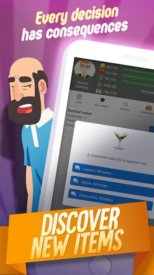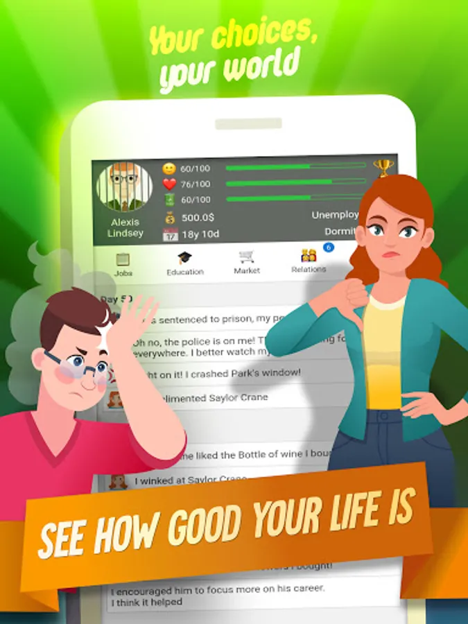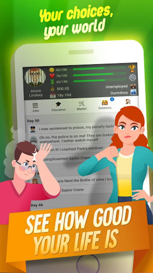 This RPG in real life allows you to pick a gender, name, face, and some basic customization. Then you can start playing the fun simulator life game at 16 years old. Follow the in-depth in-game tutorial and delight in the idle life sim top simulation game.