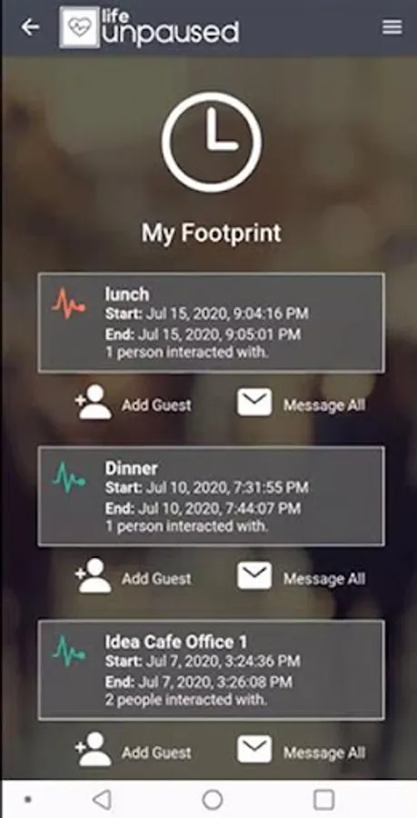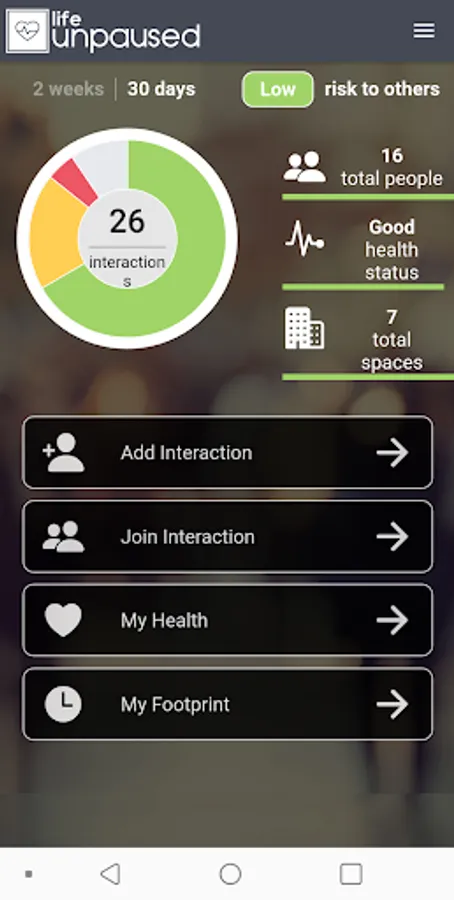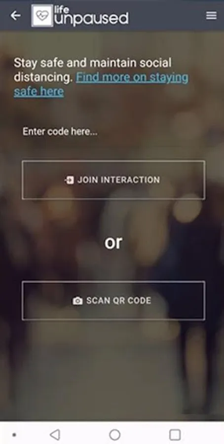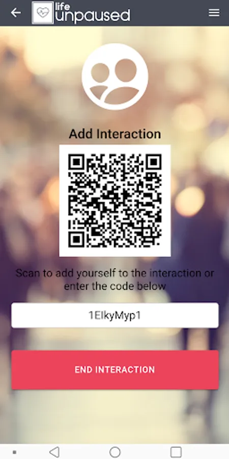 The life unpaused registry of interactions is safe and secure. All you need to provide to get started is a valid email. You have the option to enter a status and share it with others you've interacted with. The app enables you to create an interaction, pop up a unique QR Code which identifies that interaction and display the QR Code to others. They use their app to scan the QR Code and join your interaction.
