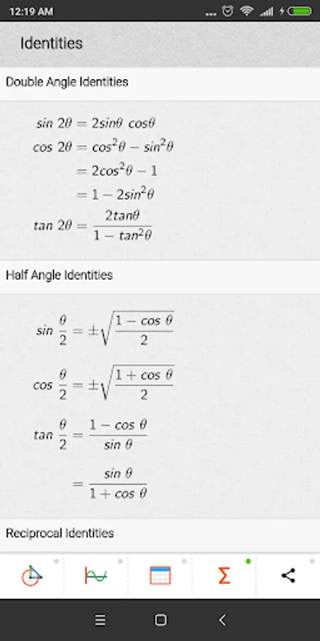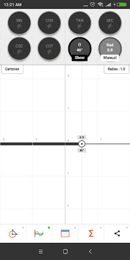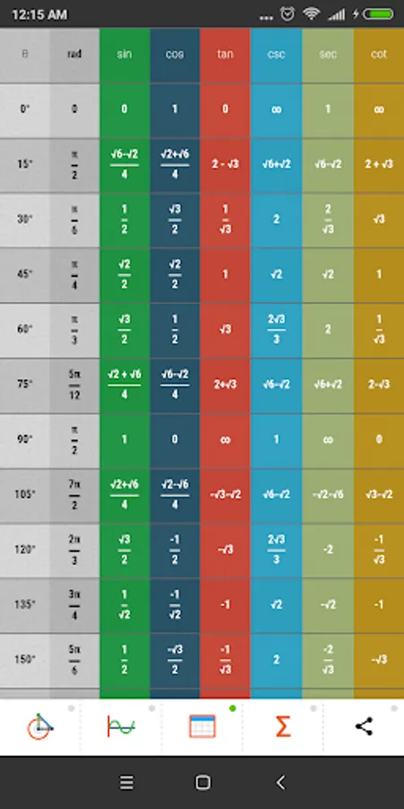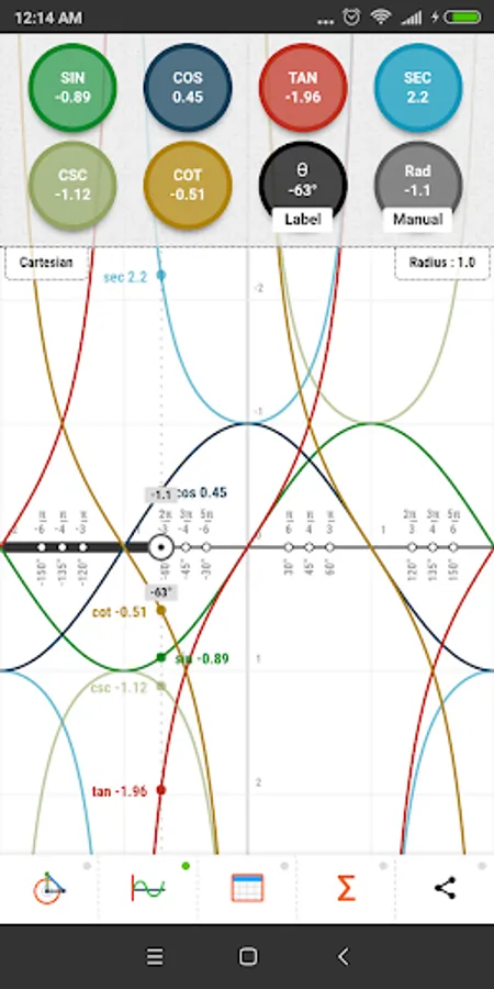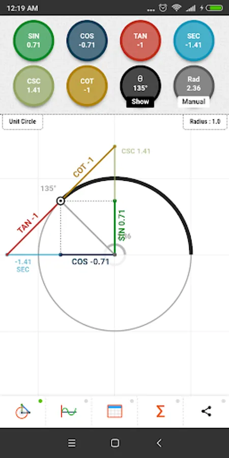 This app mainly deals on Unit Circle Trigonometry. It contains an interactive unit circle for all trig functions such as sine, cosine, tangent, secant and cosecant for both degree and radian between 0 and 360 degrees. It also contains interactive graphs for all the above specified trig functions between -180 to 180 degrees. It is also provided with table of trig ratio for all the trig functions from 0 to 360 degrees with the increment of 15 degrees. As a supplement, this app is also provided with some important trigonometry formulas and identities.
