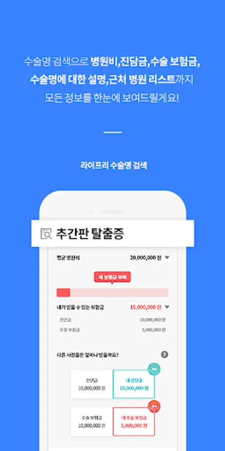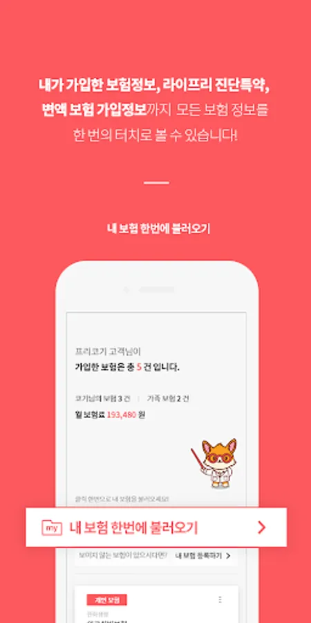 - You can search for insurance and analyze coverage through a simple process through mobile phone authentication, and when searching for the name of a disease or surgery, you can check the 'expected insurance amount' that you can actually receive.