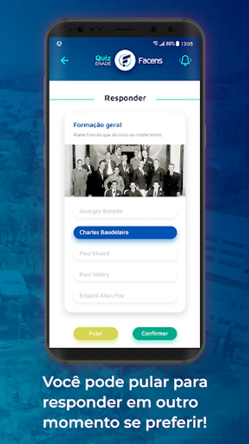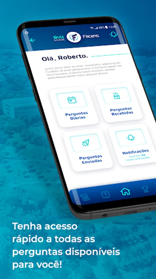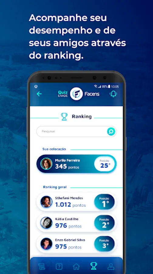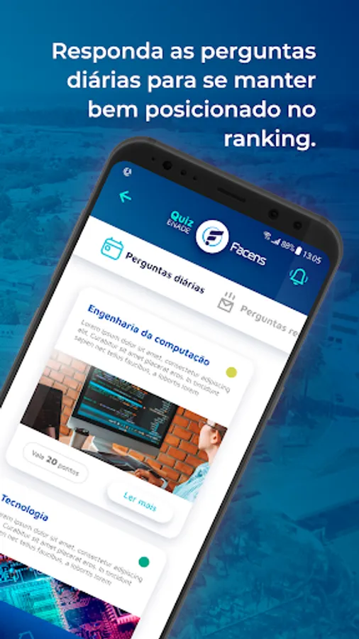 The ENADE - DESAFIO QUIZ FACENS application has a set of questions based on the previous ENADE tests, opening the way to the knowledge to get you ready for the evaluation!