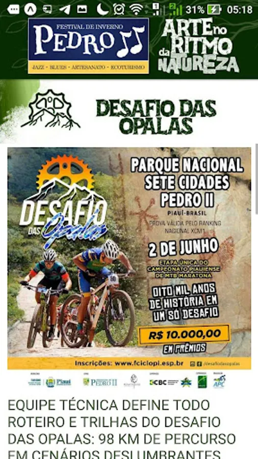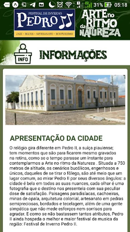 With the application you can follow everything about the 16th edition of the Pedro II Winter Festival, an event already consolidated as Piauí's biggest cultural festival, bringing audiences of the most diverse in the true art of meeting: always new, rejuvenated and improved.