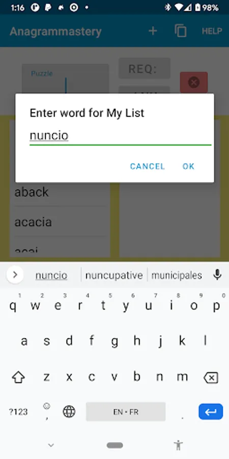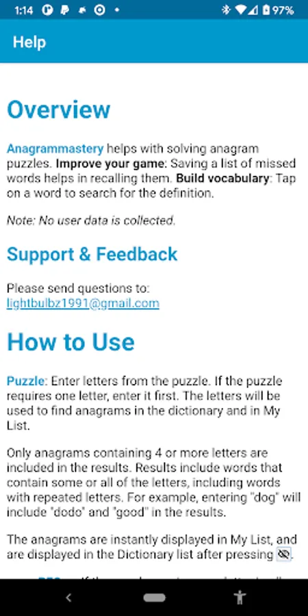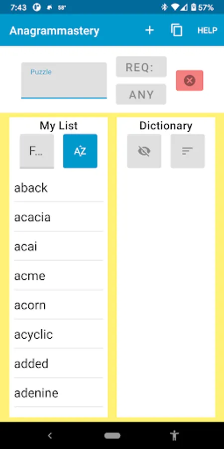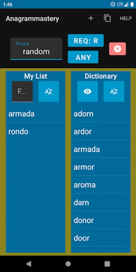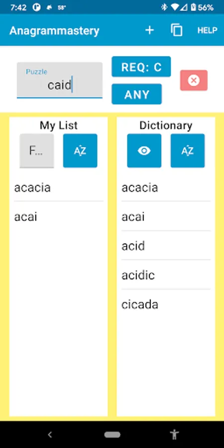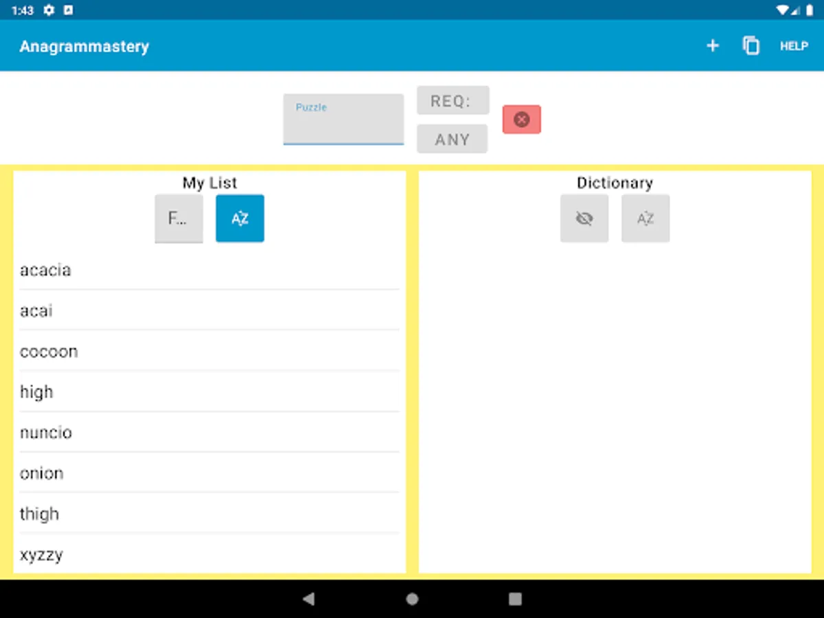 Enter letters from the puzzle. If one letter is required, enter it first. The letters will be used to find anagrams in the built-in dictionary and in My List (saved words). Anagrams containing 4 or more letters are included in the results. Results include words that contain some or all of the letters, including words with repeated letters. For example, entering "dog" will include "dodo" and "good" in the results. Tap the "REQ" button to find only anagrams that include the required letter. Tap the "ANY" button to find anagrams using any/all of the puzzle letters.