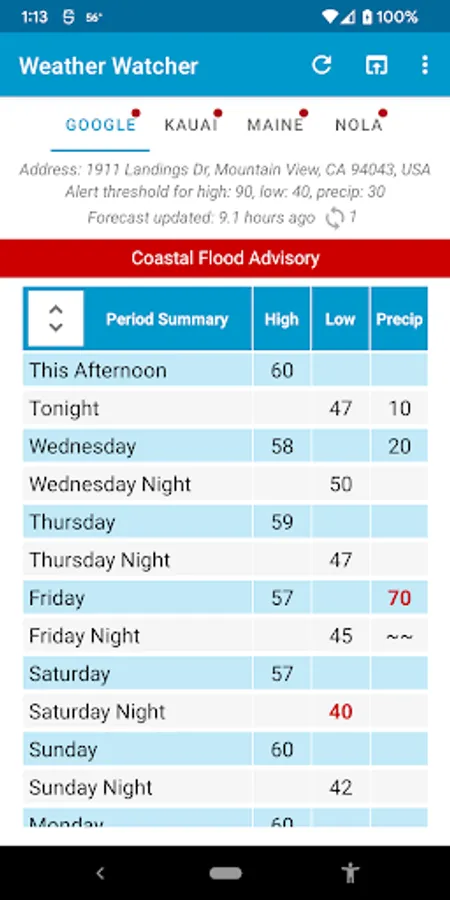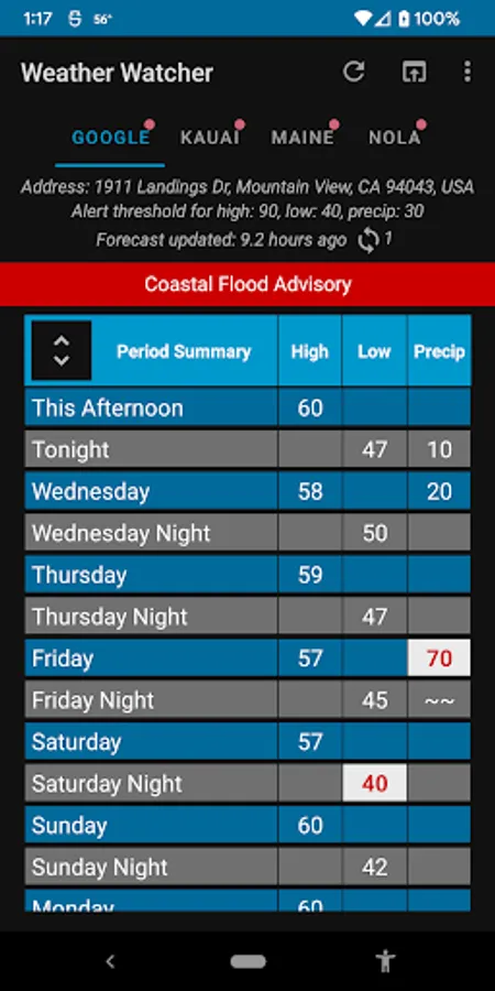 When you get a notification, tapping on it will show you the 7-day forecast highlighted based on your alert settings. It will also show you if the National Weather Service has any active hazardous weather warnings for your area.