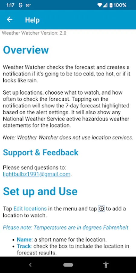 Notes: Weather Watcher does not use location services; The coordinates needed to get the forecast are found using the location you entered.
