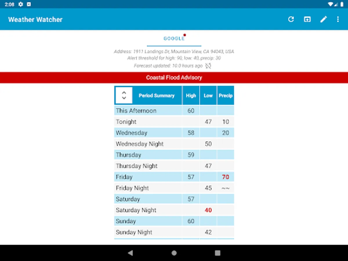 ★ You can customize the high and low temperatures and chance of rain that you want to watch for one or more locations. Most weather services only send alerts for frost and severe weather conditions. If you want to watch the weather on your terms, Weather Watcher is the app for you! Weather Watcher runs as a service, checking the 7-day forecast from the National Weather Service day and night, and alerts you automatically