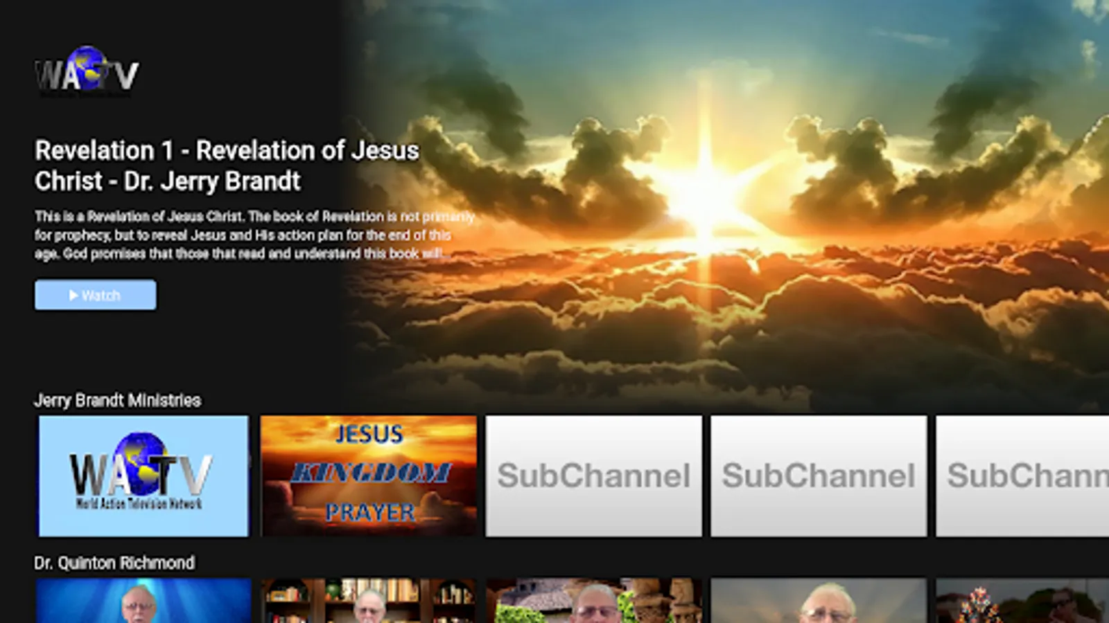 WATV network provides you a platform to publish your own exclusive videos on your Android TV channel. With personalized artwork that is your brand, people can find you easily and quickly. A great way to experience your full broadcast TV channel with your videos on demand. Just your content, no adds, no interruptions. You can be seen 24/7 with just a click on the Android Player button. We feature businesses like Revenue Generation Activity Network, as well as individual ministries and churches.
