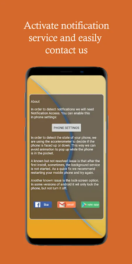 Warning: This app is using the accelerometer of the phone. The notification will pop up when the phone is resting on a plane surface, with the screen off (compatible with always on display). If you have under 15% battery left and you want to use our app, turn off battery saver.