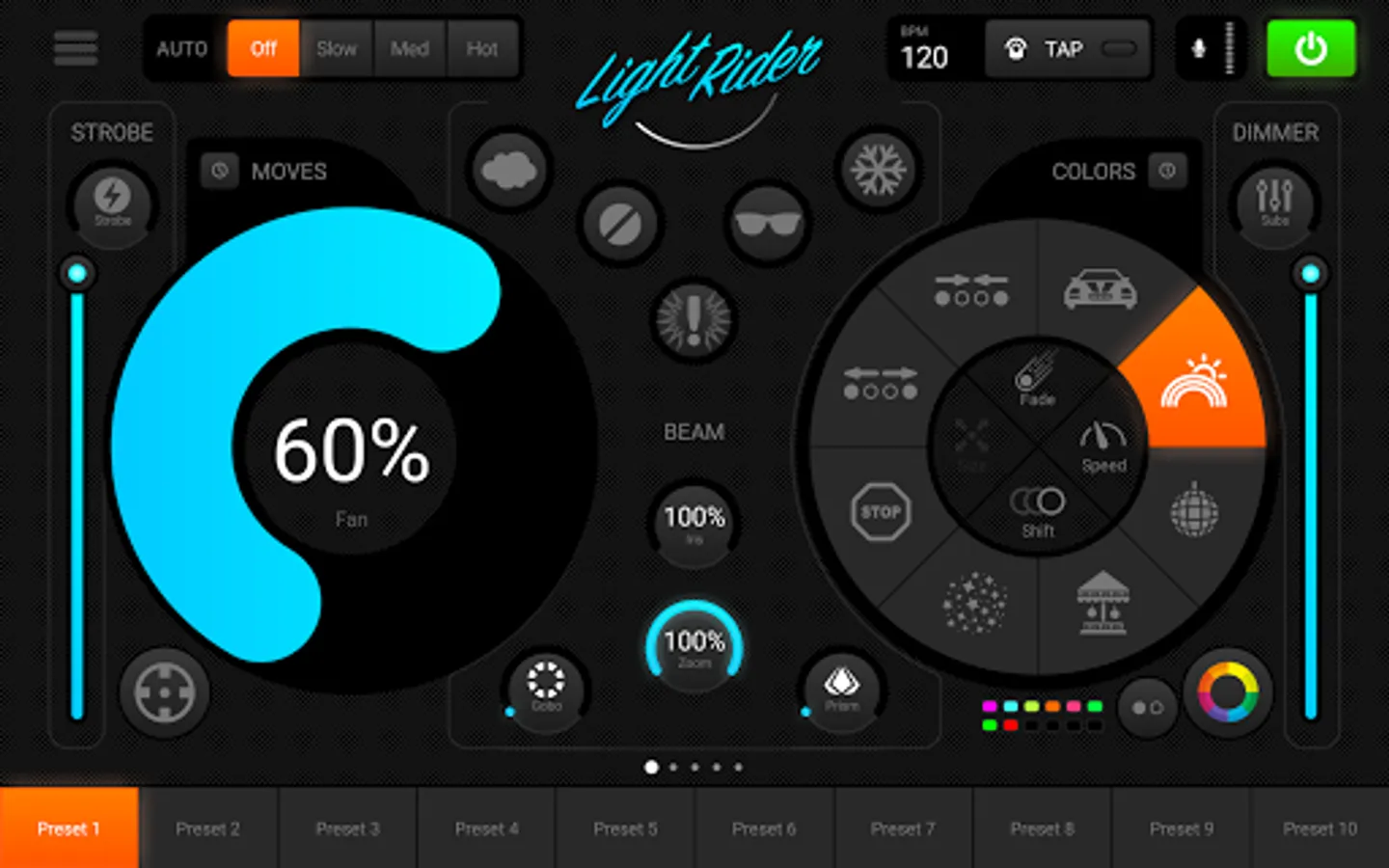 Light Rider lets you control your DMX lights without needing to program anything. Choose from over 15,000 lighting fixtures and once added, they will bounce, chase, ride, sparkle and perform a light show like you’ve never seen before!