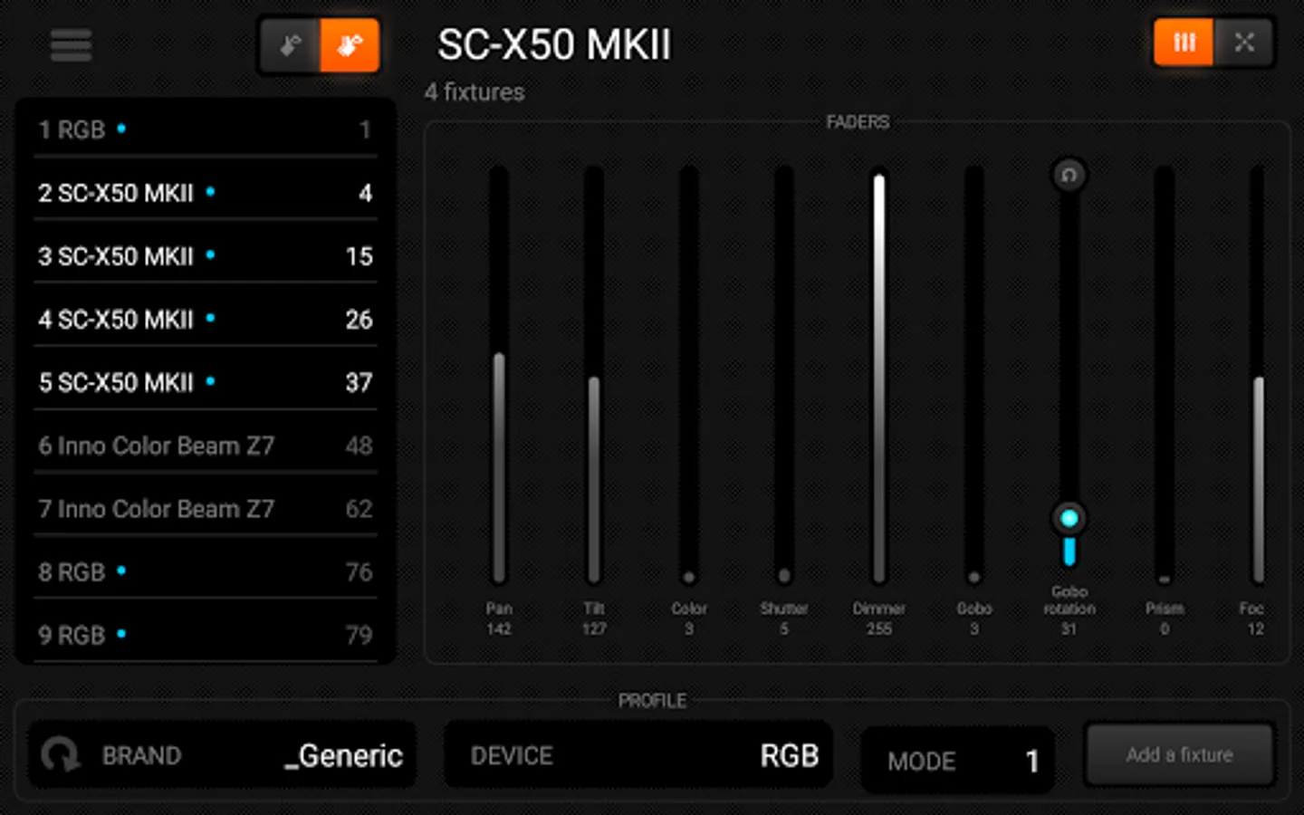 Light Rider is compatible with 1 DMX universe (512 channels). To connect the app with your lights, you can use the LR512 WiFi device, or a compatible SUT device with the Light Rider licence.