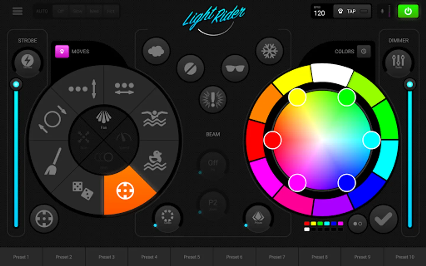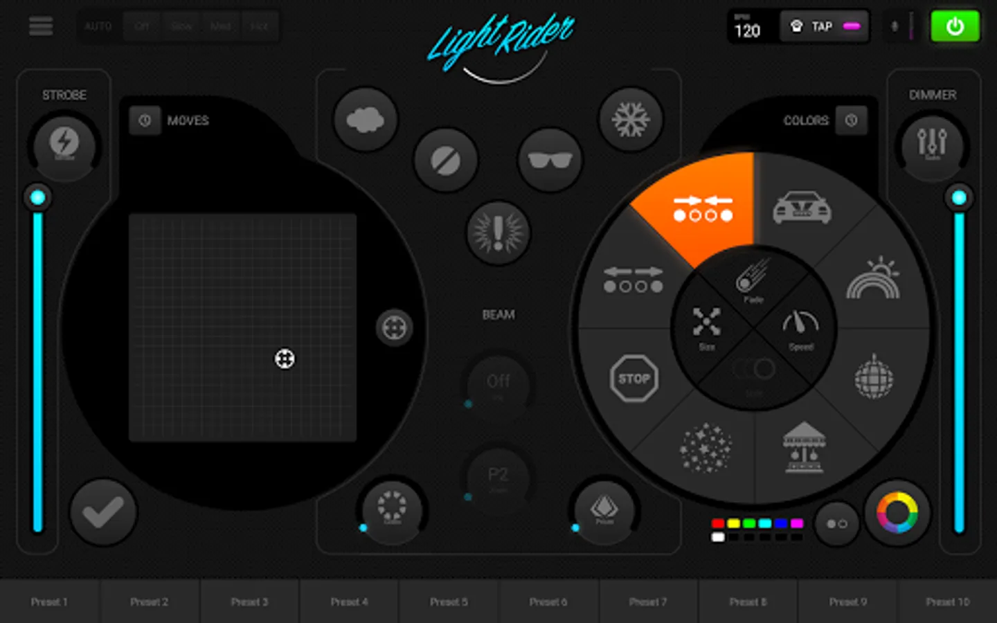 Built on over 25 years of DMX lighting control experience, Light Rider finally puts a great light show into the hands of a working DJ, who might not have the time to spend hours programming scenes before a show. Carefully crafted by Light Rider’s developers and DJs - Move FX are on the left, Color FX on the right, Flash FX in the middle and presets along the bottom. Ride your FX live with the speed, fade, fan, size and shift controls. Sync with the music using audio Pulse analysis and Beat Tap.