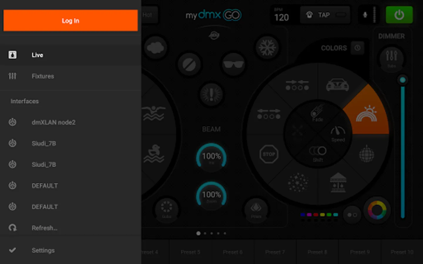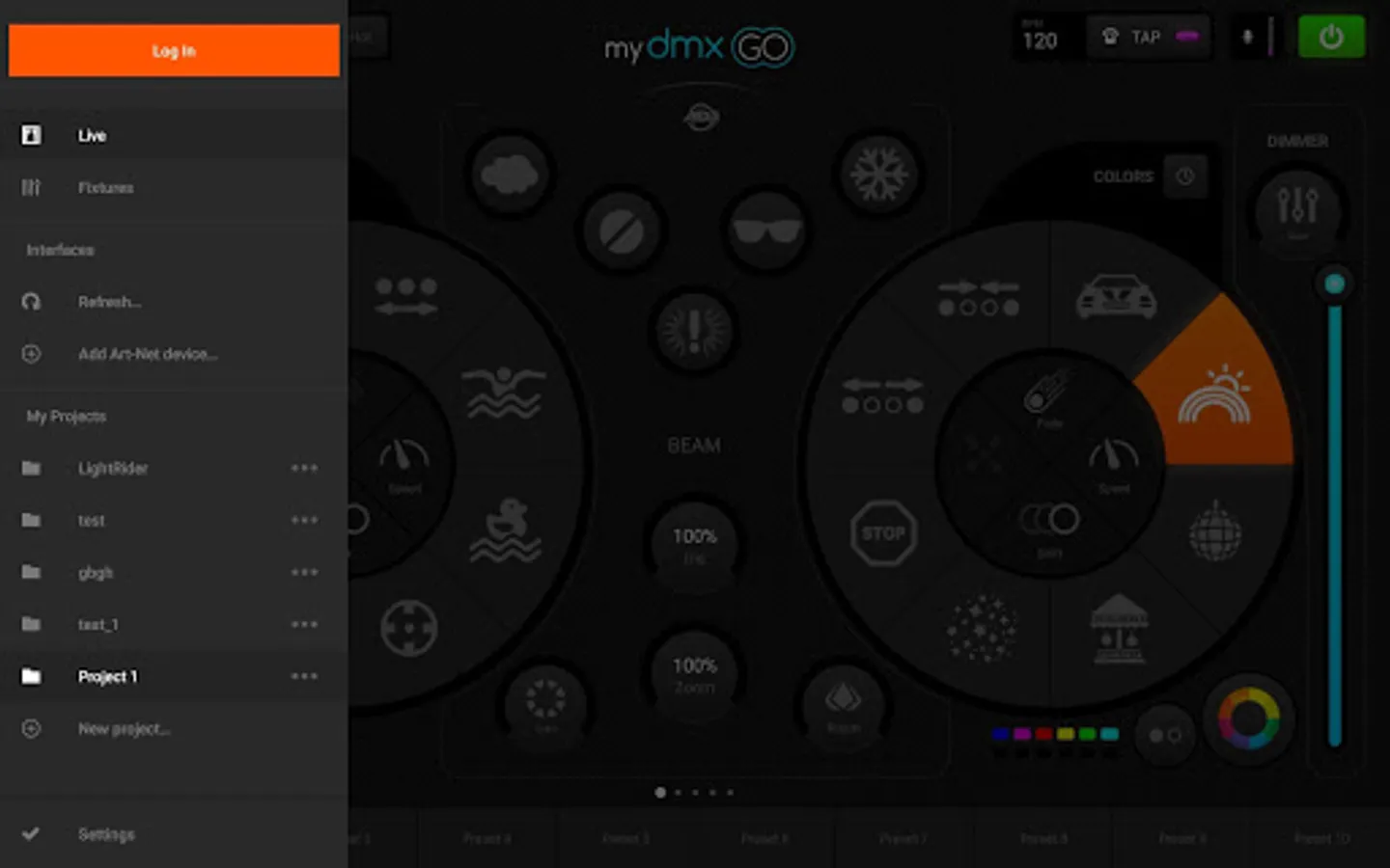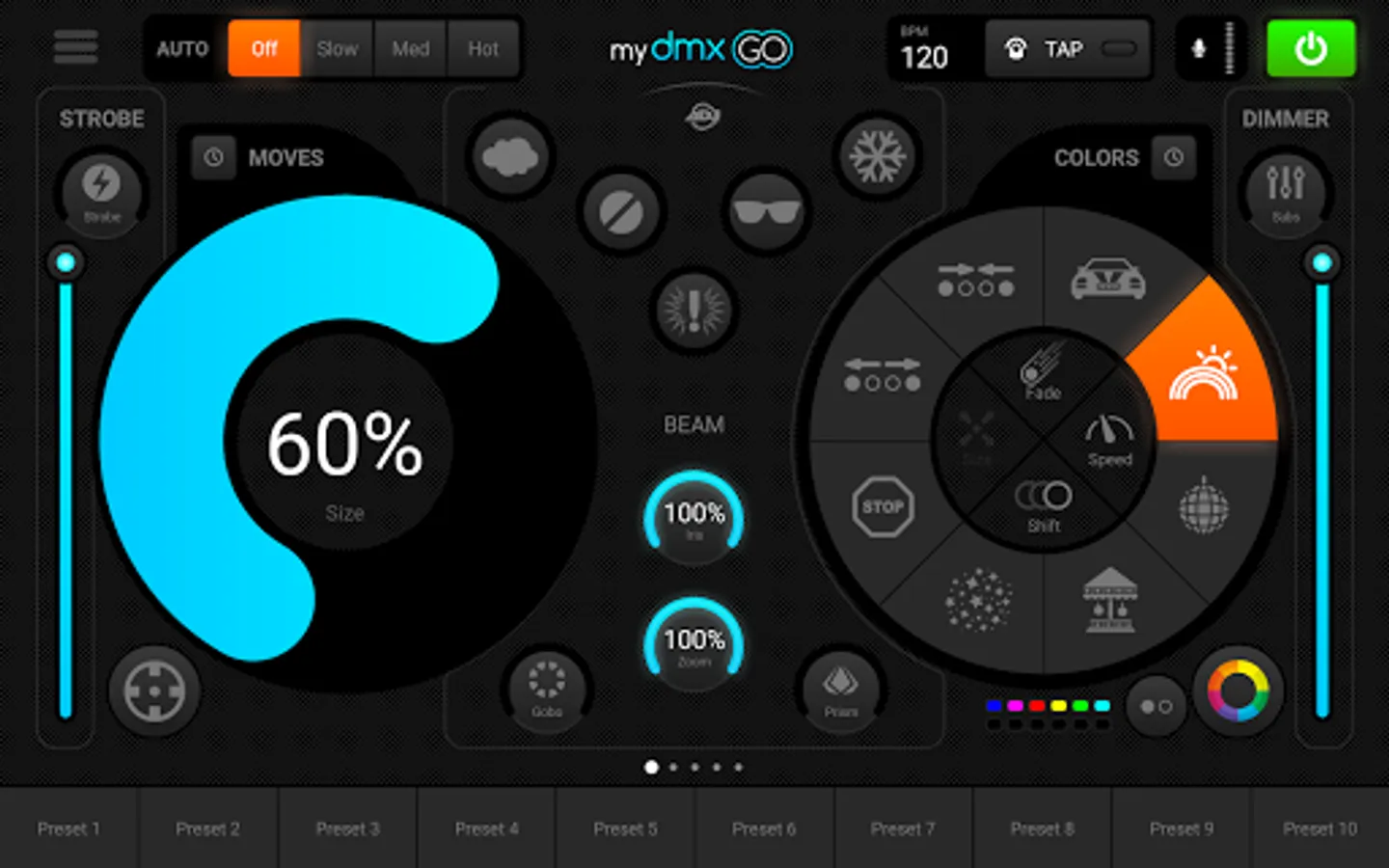 The myDMX GO app requires zero programming but can be used to create stunning synchronized lightshows across any combination of lighting fixtures. It’s distinctive layout features two FX wheels – one for color chases and one for movements patterns – which each contain eight pre-programmed effects. These can be selected independently, customized (by altering the color palette, speed, size, shift and fan) and combined to create a vast number of different unique effects which can then be stored for instant recall to one of 50 user-defined presets. In a matter of seconds, incredible lighting displays can be easily created that would require hours of programming using traditional control systems.