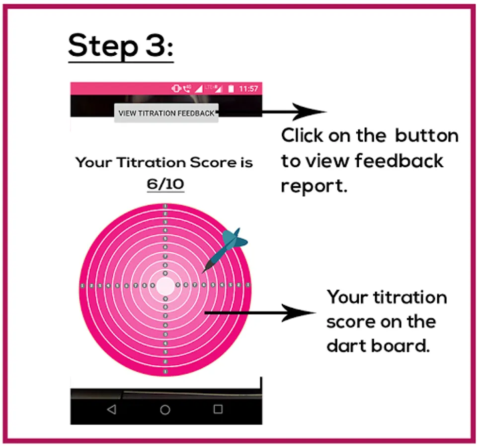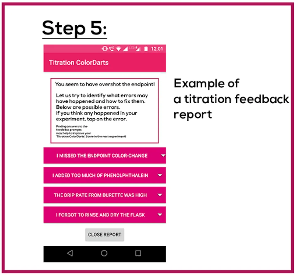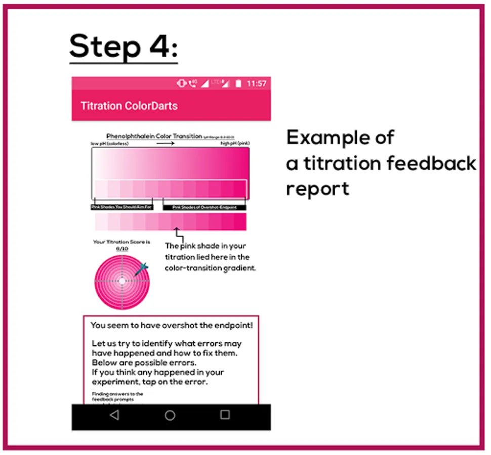 Titration ColorDarts (TCD) is aimed to enable the learners to identify the probable errors in their titration experiment independently. TCD provides a real-time feedback report which includes gamified performance scores, question prompts and hints for taking measures to resolve the errors in the subsequent experiment iterations by self-assessment.