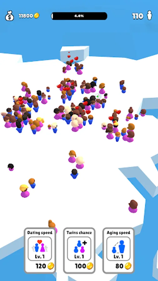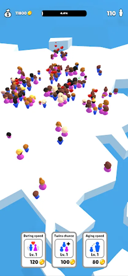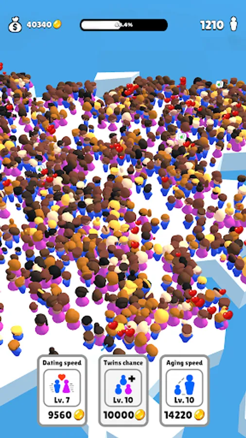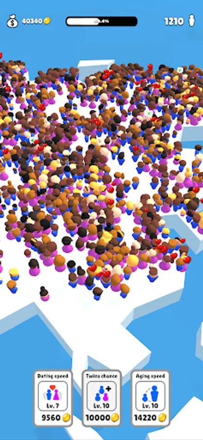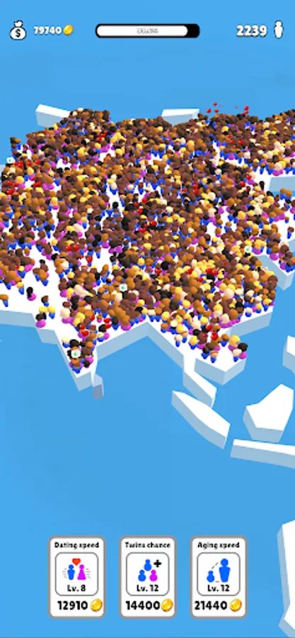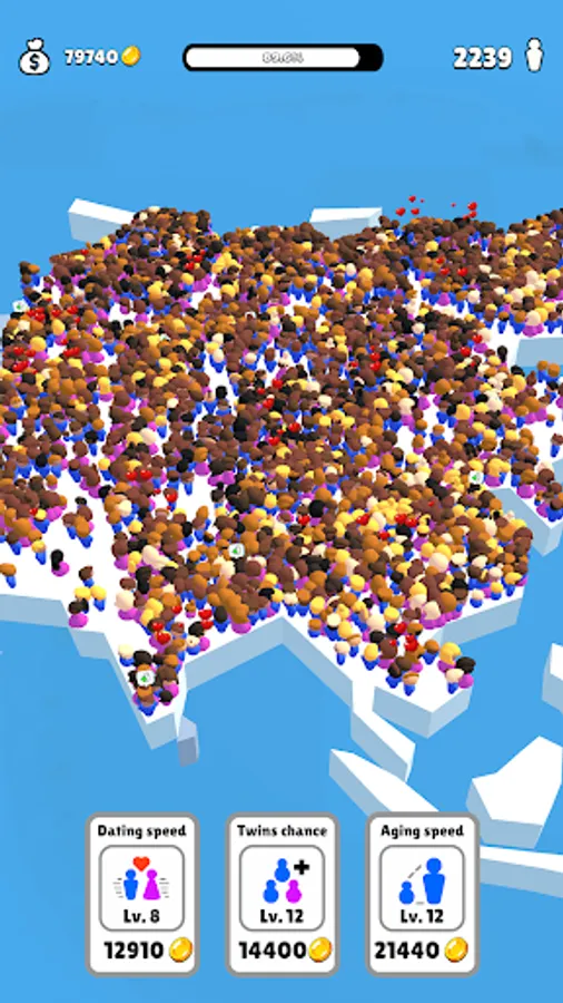 like in real life, wait for people to meet, date and fall in love. From their love will come babies, which in time will also make babies, etc, etc … For each birth you get money. Use it to purchase upgrades for your little humans: increase the speed of dating and aging so they can meet people faster ! Increase babies rates to get twins, triplets and more ! Start from 2 people, date / mate / birth and get more and more people,until you repopulate the whole planet ! “A romantic approach on humanity's primal mission: reproduce and populate. Get the God-like satisfaction of overseeing the earth, and watch your creations multiply under your eyes. A minimalist and contemplative simulation of how 2 people can multiply to populate the entire planet !