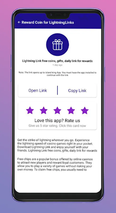 We share with you all the latest Lightninglink coins, daily link that you might search online, now you don’t need to search on any internet. There are type of reward that Is provided in this app such as coins, chips, reward bonus etc..
