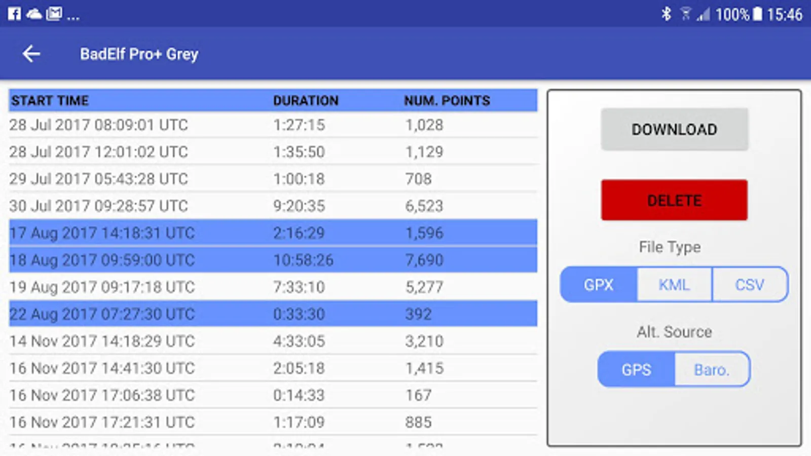 - Download and delete tracklogs, storing them on your Android phone or pad, or any file service that you have installed - OneDrive, DropBox, email, Google Drive and others. Files can be saved in GPX, KML and CSV formats.