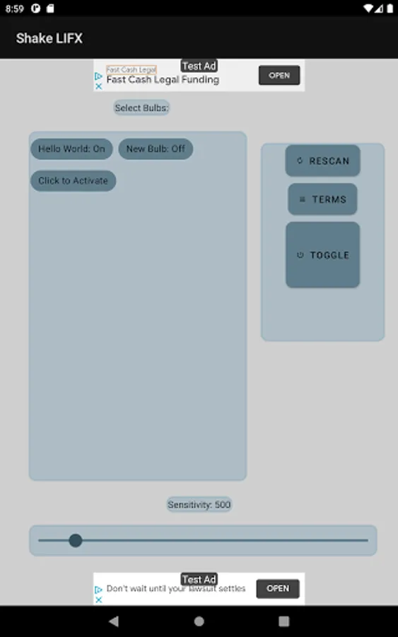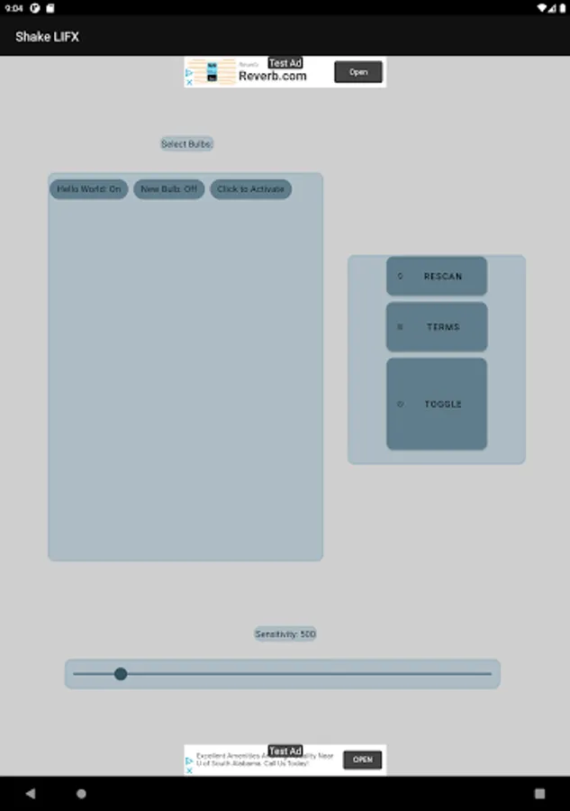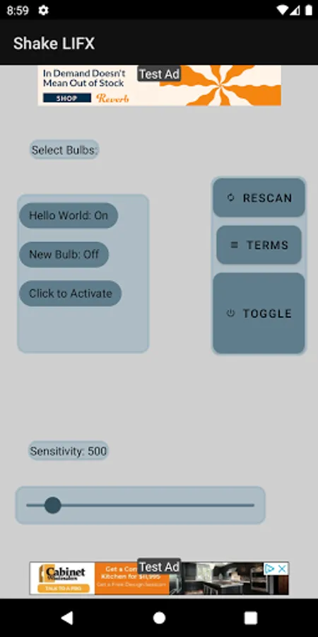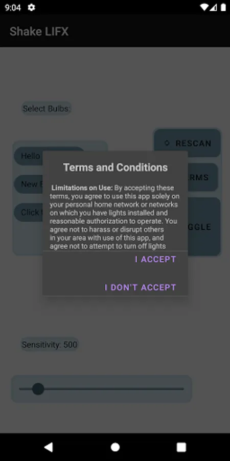 This app uses your phone's accelerometer to turn your home lights on and off. Click on the individual light's name to toggle whether or not this app will affect it, and use the scrollbar to change the shake sensitivity. The power button will toggle the service on and off (runs in background). Hit rescan incase all lights aren't detected.