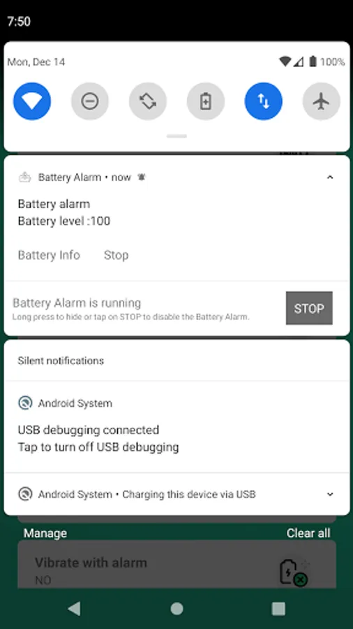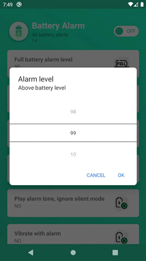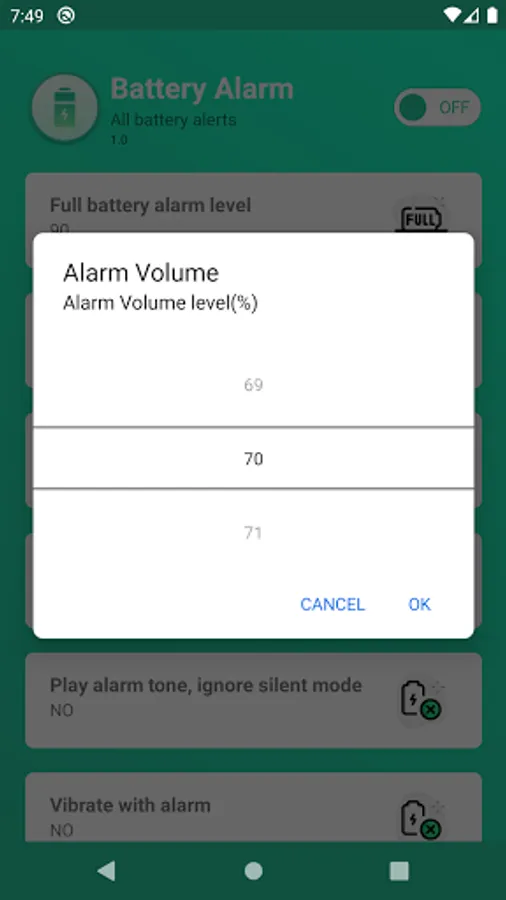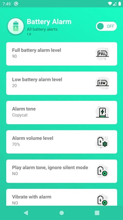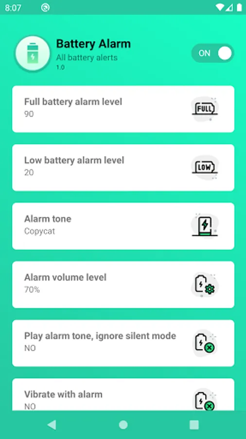 Battery Alarm notifies you when your battery is fully charged or when battery is low.