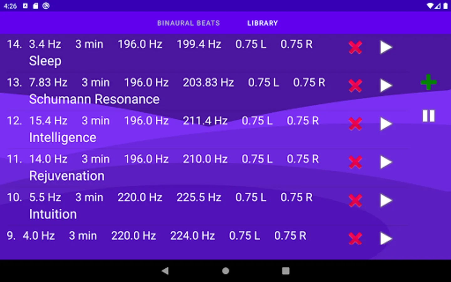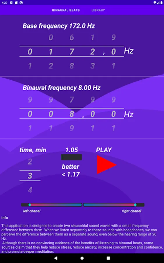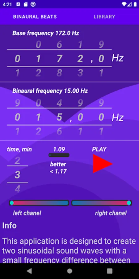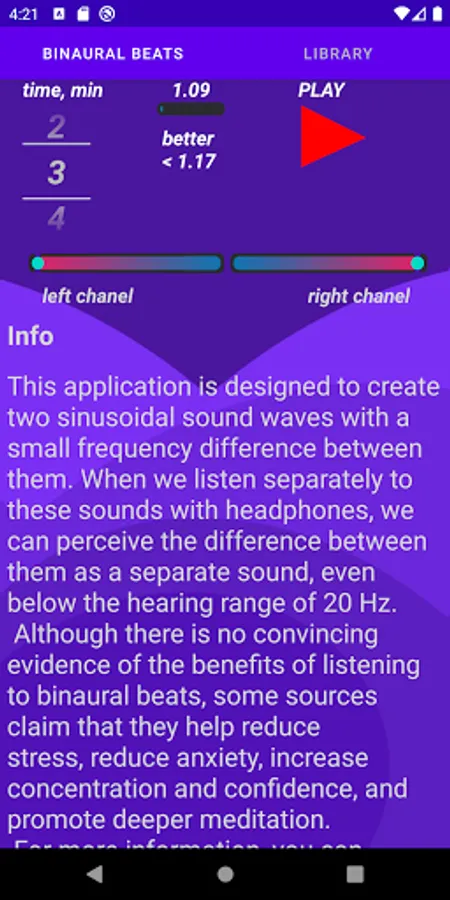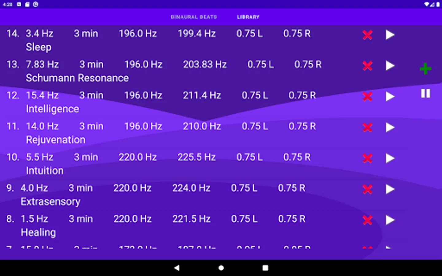 The application allows you to adjust the fundamental frequency and the frequency of binaural bits, playtime, and volume of each channel. When a certain binaural bit is set, you can save it for future use by pressing the "+" button on the second page of the application. On this second page, there are several sample frequencies for easy testing of the application. Once the settings are saved, a description can be entered to remind you of the purpose.