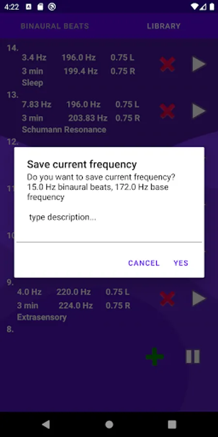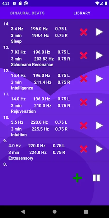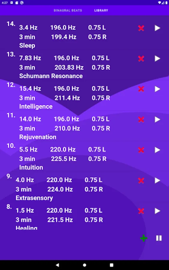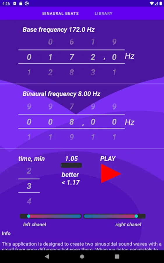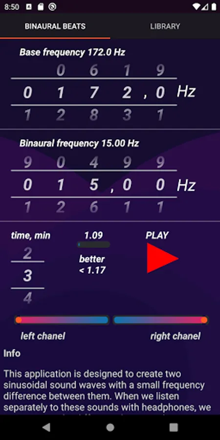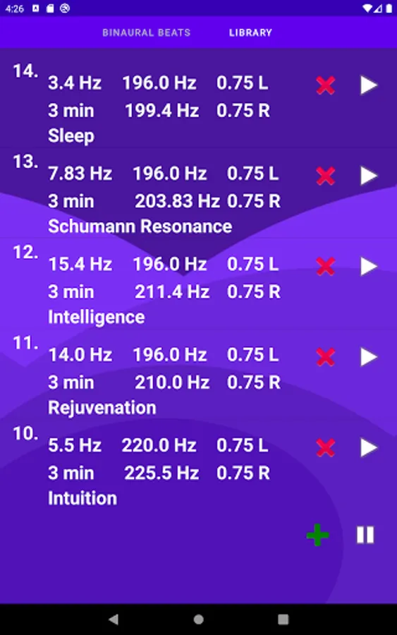 The application allows you to adjust the fundamental frequency and the frequency of binaural bits, playtime, and volume of each channel. When a certain binaural bit is set, you can save it for future use by pressing the "+" button on the second page of the application. On this second page, there are several sample frequencies for easy testing of the application. Once the settings are saved, a description can be entered to remind you of the purpose.