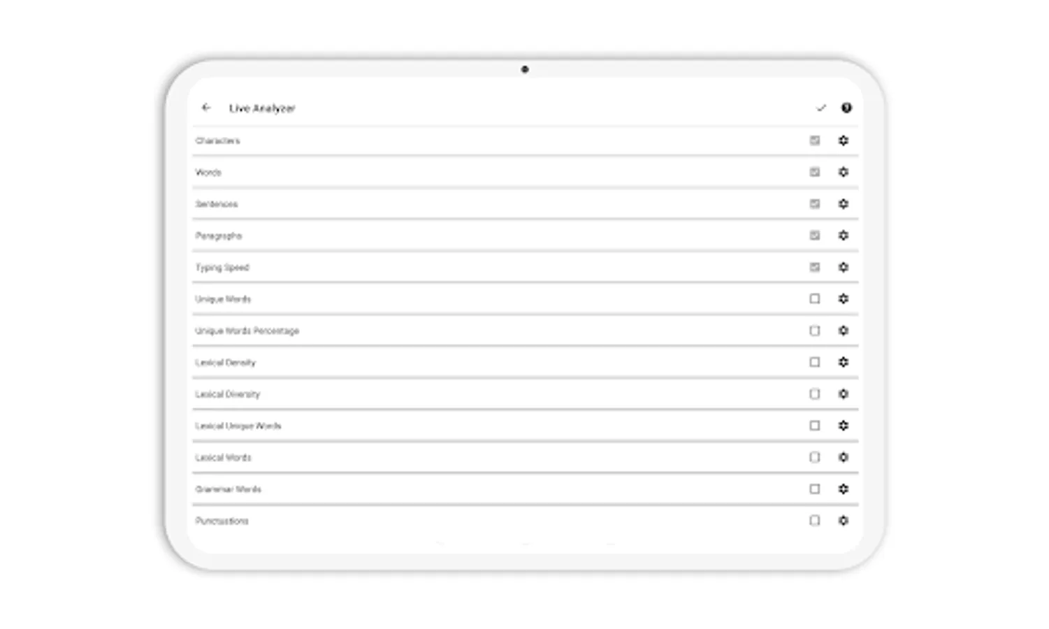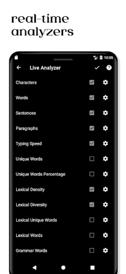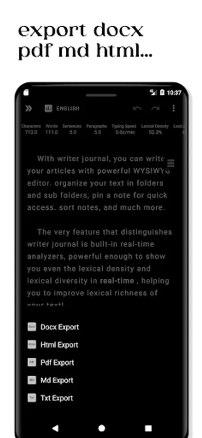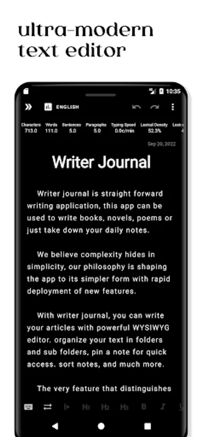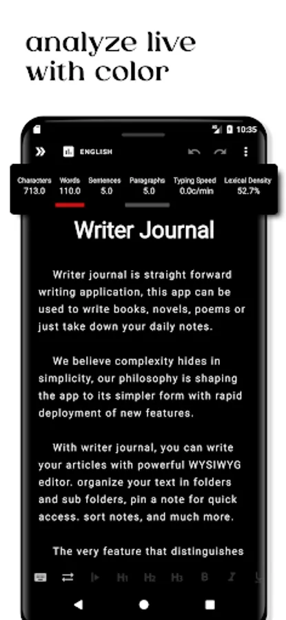 Well, unlike many similar journal apps in the market, it has the most powerful built-in real-time text analyzers, calculating the most important information for your text helping you enrich your writing skills in terms of lexical richness, content structure, etc.