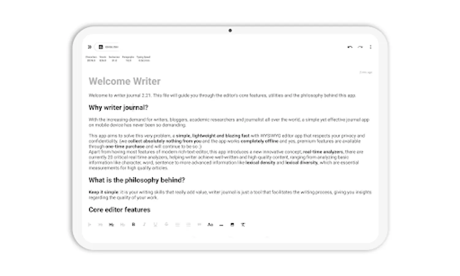 Offline writer app designed for writing better articles with real-time text analysis tool, enabling writers or bloggers to achieve high-quality and content-rich article.