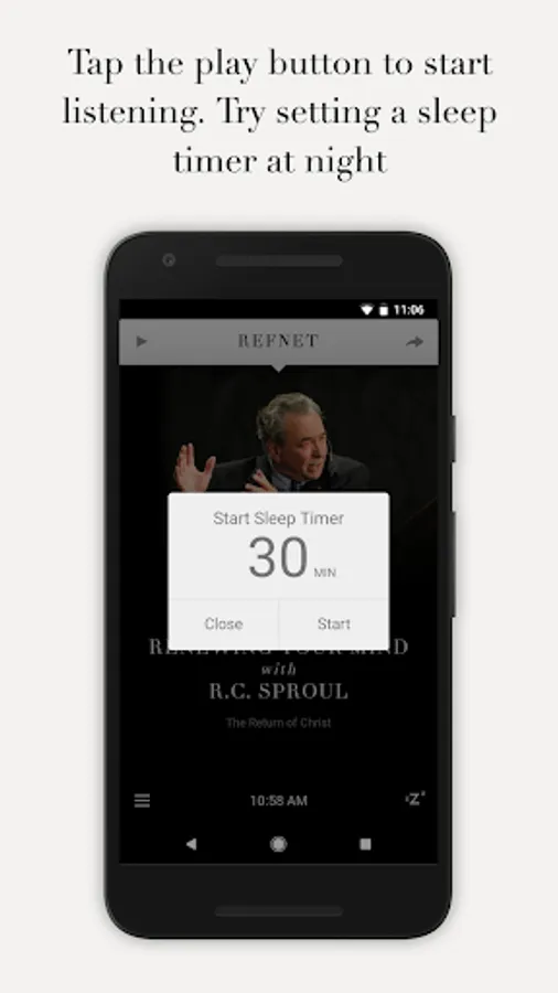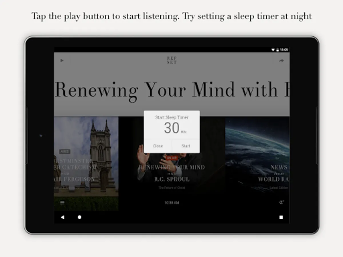 To begin listening to RefNet, open the app and press the play button in the top left of the screen. To finish listening to RefNet, press what is now a stop button in the top left of the screen or use the new sleep timer function.