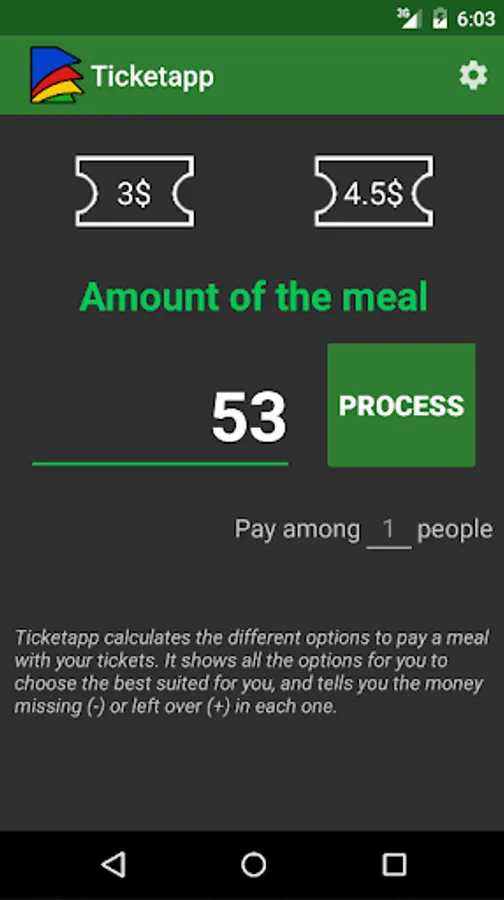 The first time you use Ticketapp you must enter the value of your tickets in the configuration page, then when you go to a restaurant just enter the amount of the bill, and Ticketapp will show you all the options to pay with your tickets.