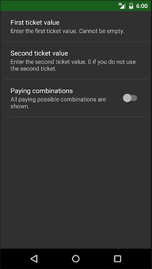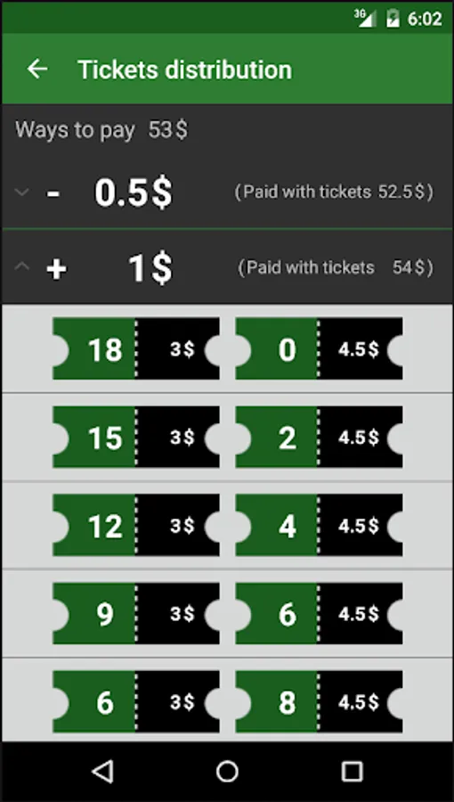By default Ticketapp shows all possible combinations, grouped according to the amount of money left over. That is, if due to the value of your tickets there is no combination possible to pay the exact amount of the bill, Ticketapp will show you how much money is left over.
