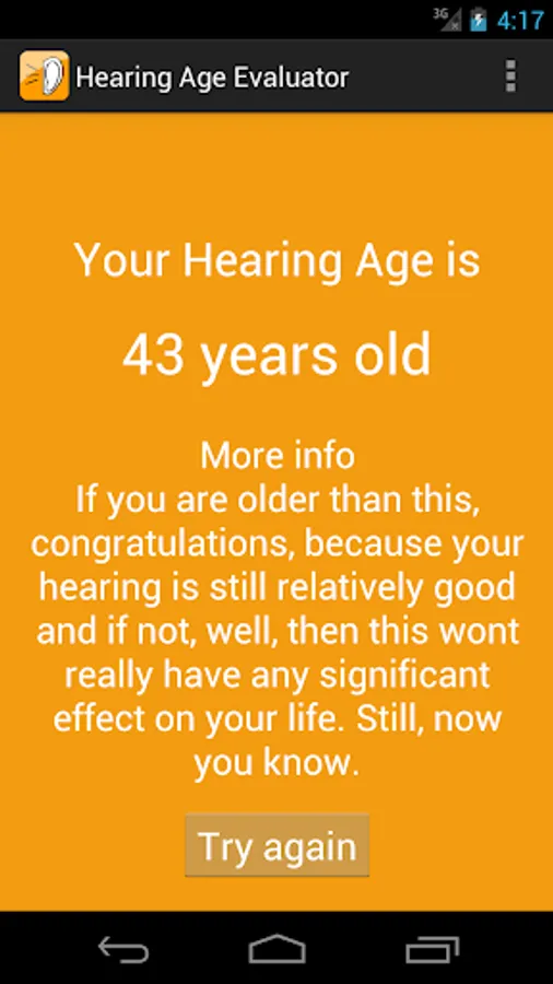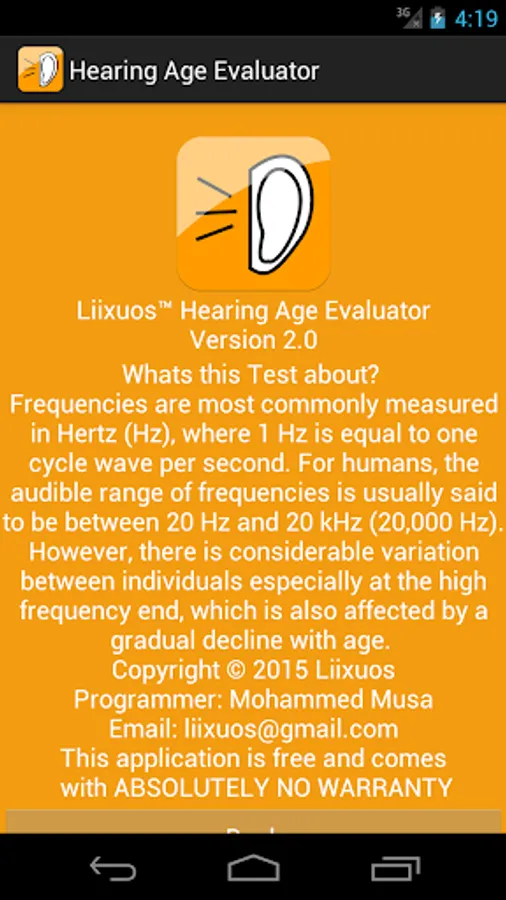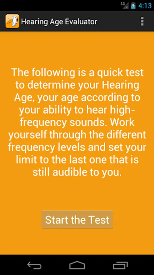 However, there is considerable variation between individuals especially at the high frequency end, which is also affected by a gradual decline with age. And this app is a quick test to determine your Hearing Age, your age according to your ability to hear high-frequency sounds.