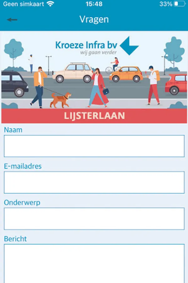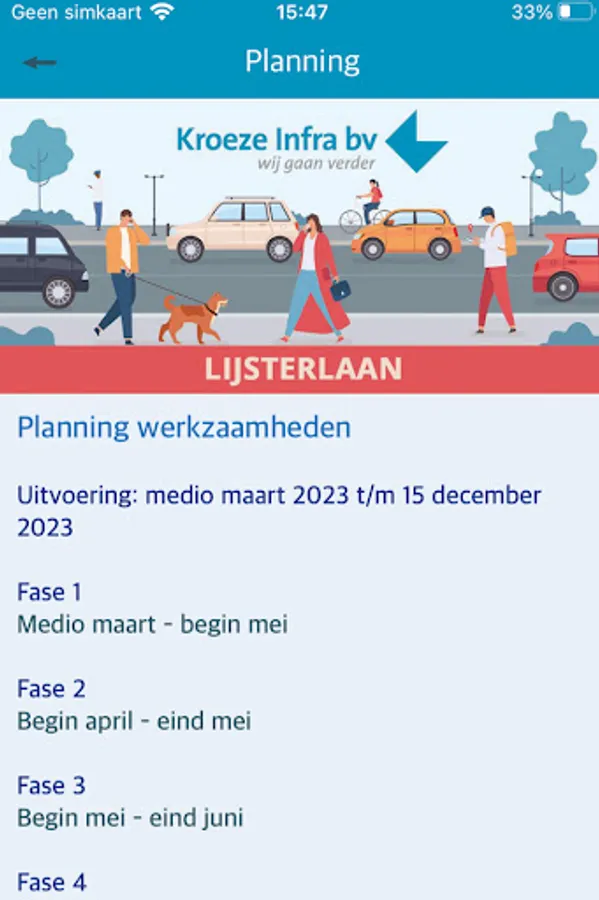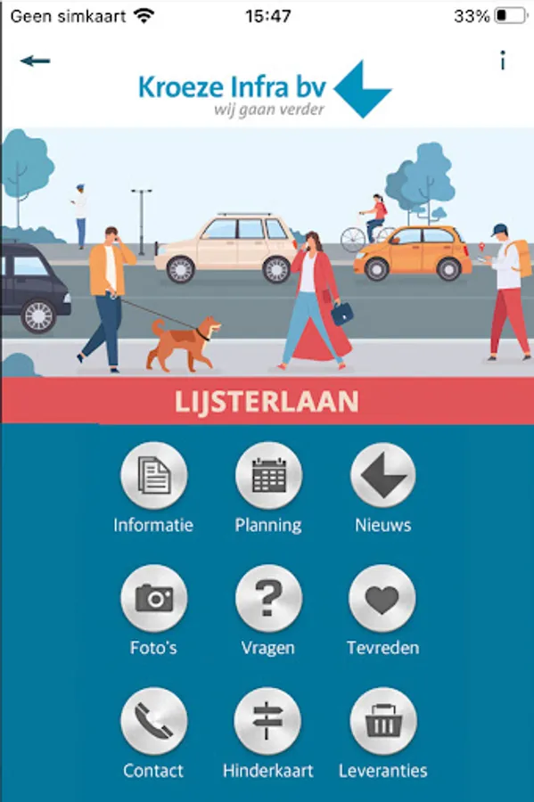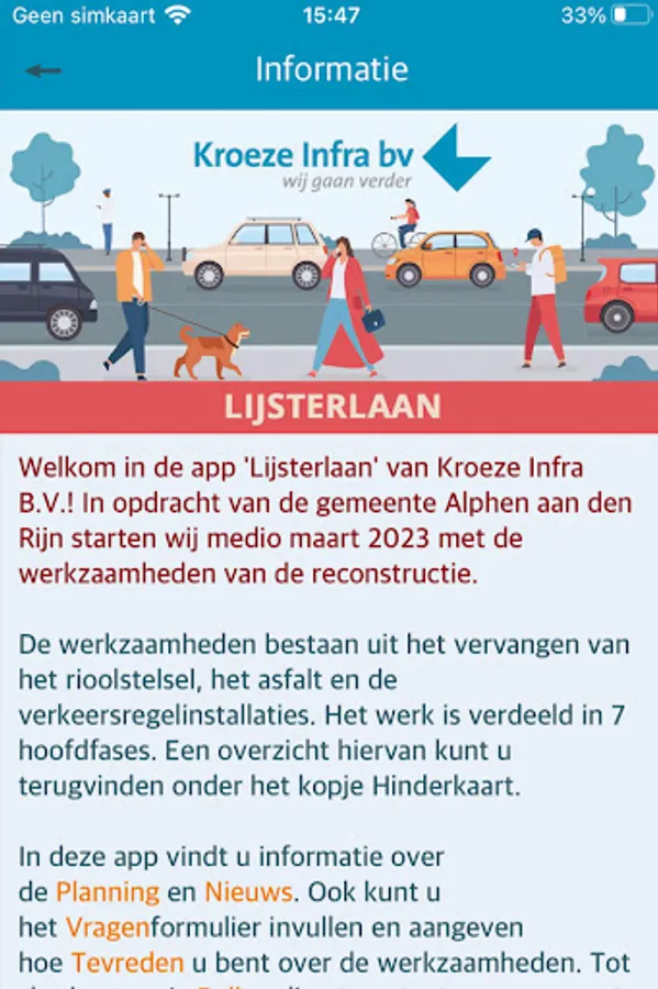 In this app you will find all information about the work of the refurbishment project 'Lijsterlaan' of Kroeze Infra BV. Important project information, the latest schedule and contact information are displayed . You can also leave questions, comments or complaints related to the project on this app.