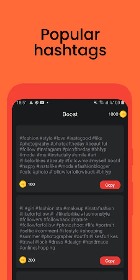 Nowadays hashtags is very effective tool to attract peoples on social media we provide filter and most popular hashtag to you just copy that and past to your post and attract people to your account and your photo you can increase likes using hashtags.