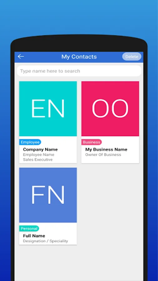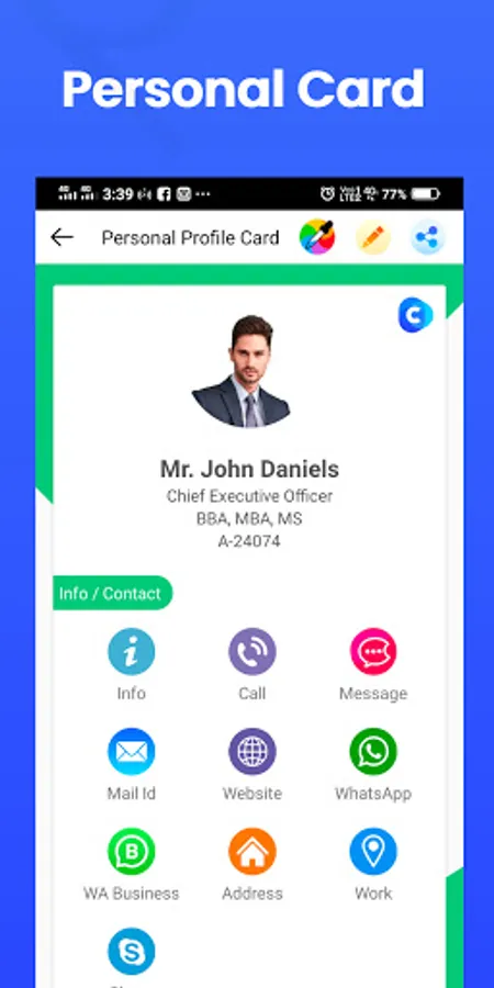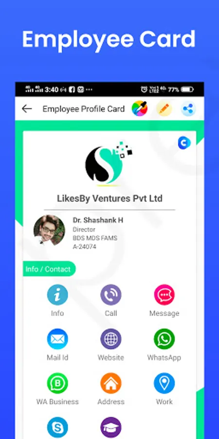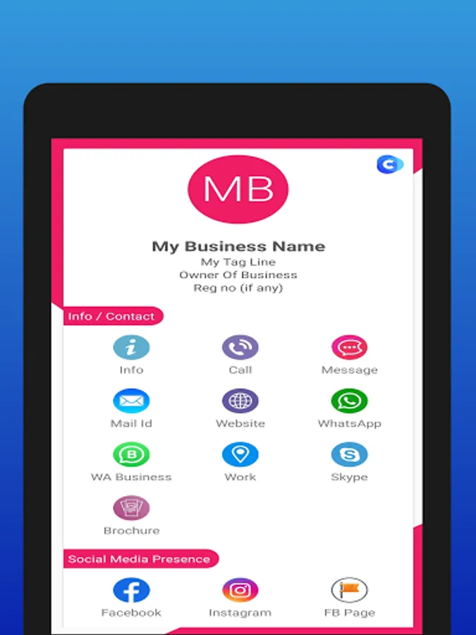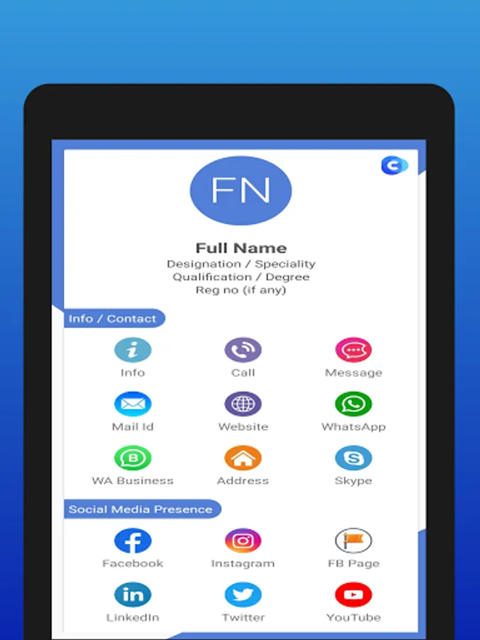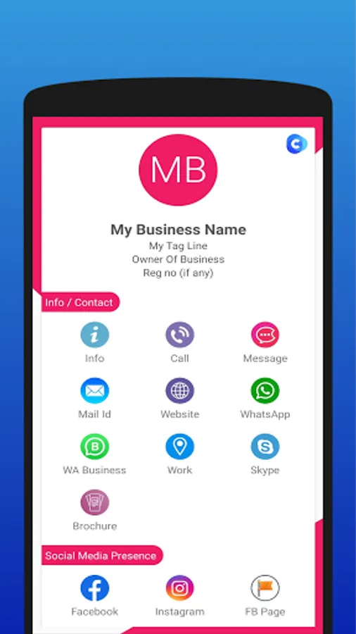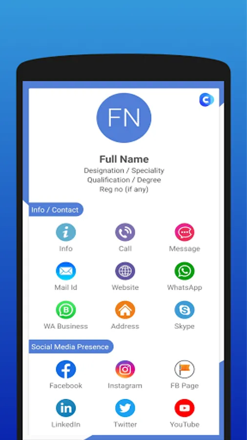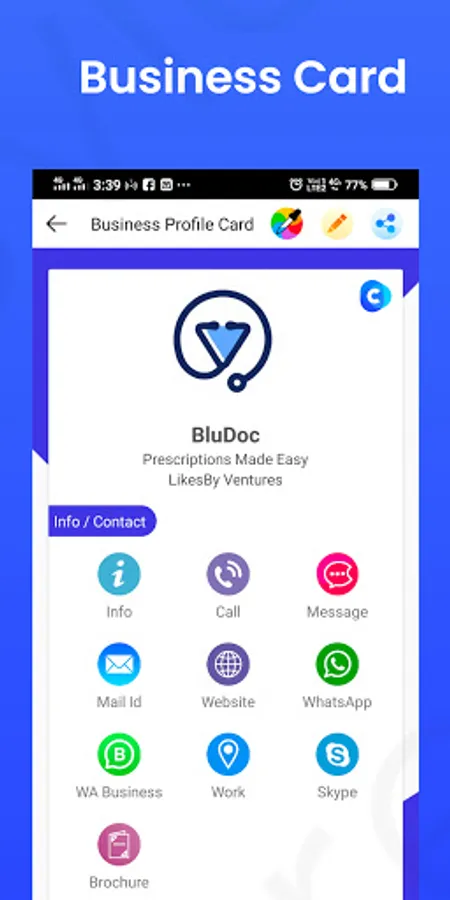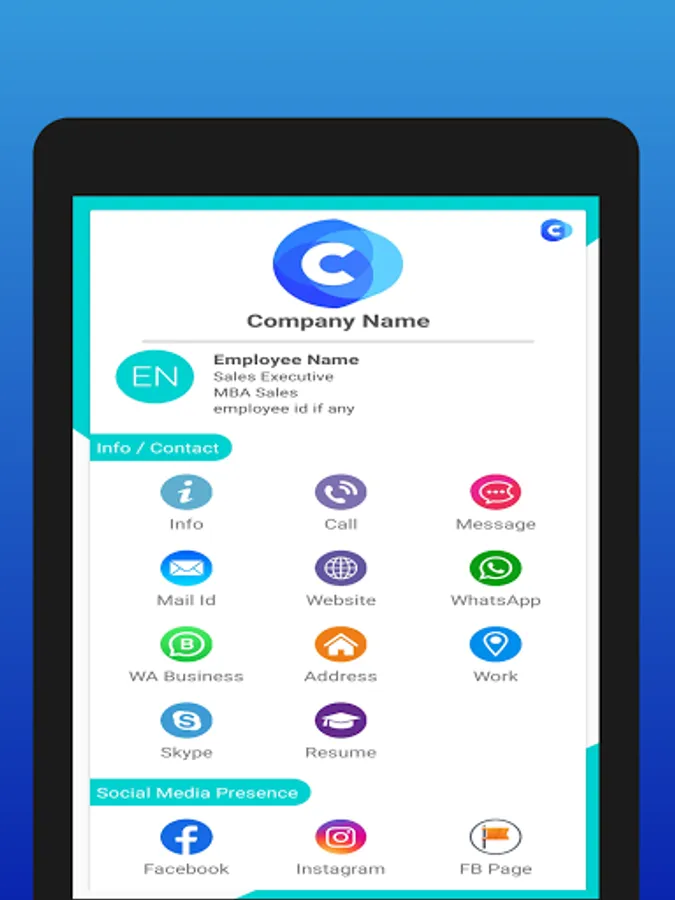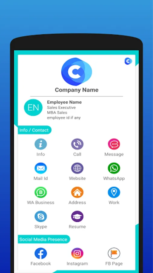 • Now no need to type and save the important contact details of your friends, clients, business employee etc. just click on the icons and get directed to the required info viz WhatsApp number, Facebook page, Instagram, website, mail ID, location, address