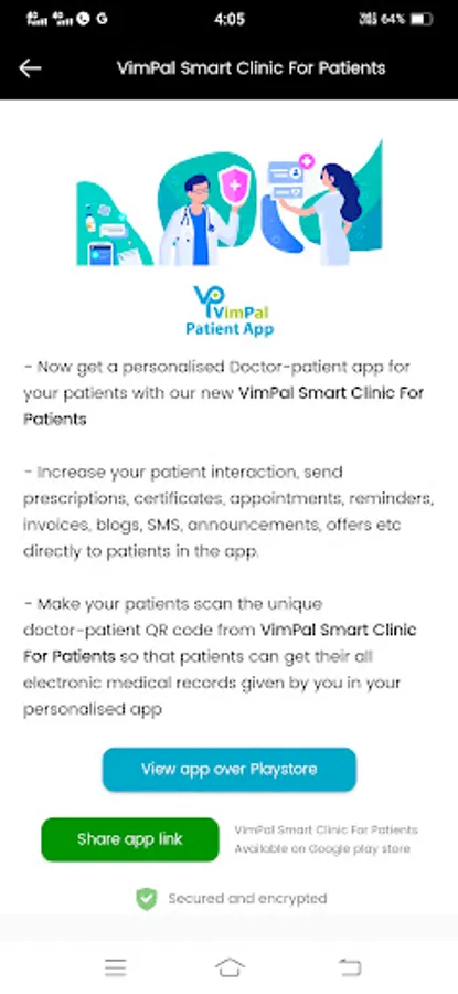 - VimPal Patient App is also available for patients. Patient can download the app from play store and scan the unique doctor-patient QR code and get all the medial records in the app itself.