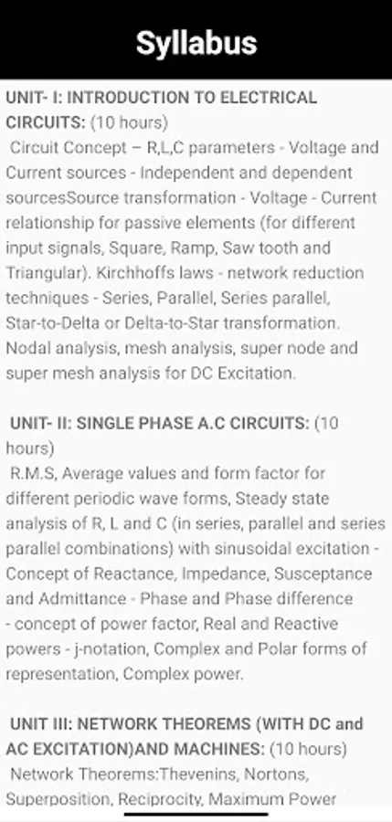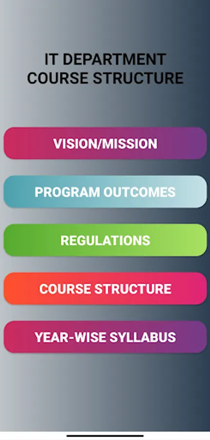 The current version of this application contains 1st and 2nd year syllabus of IT Department. Students of all branches can view academic regulations, institution rules and grading system. Students of IT Department can know Department vision, mission, and program outcomes. Students can relate subject knowledge with program outcomes. They can view subject wise syllabus along with course objectives/outcomes and references. They can view credits for each subject as well.